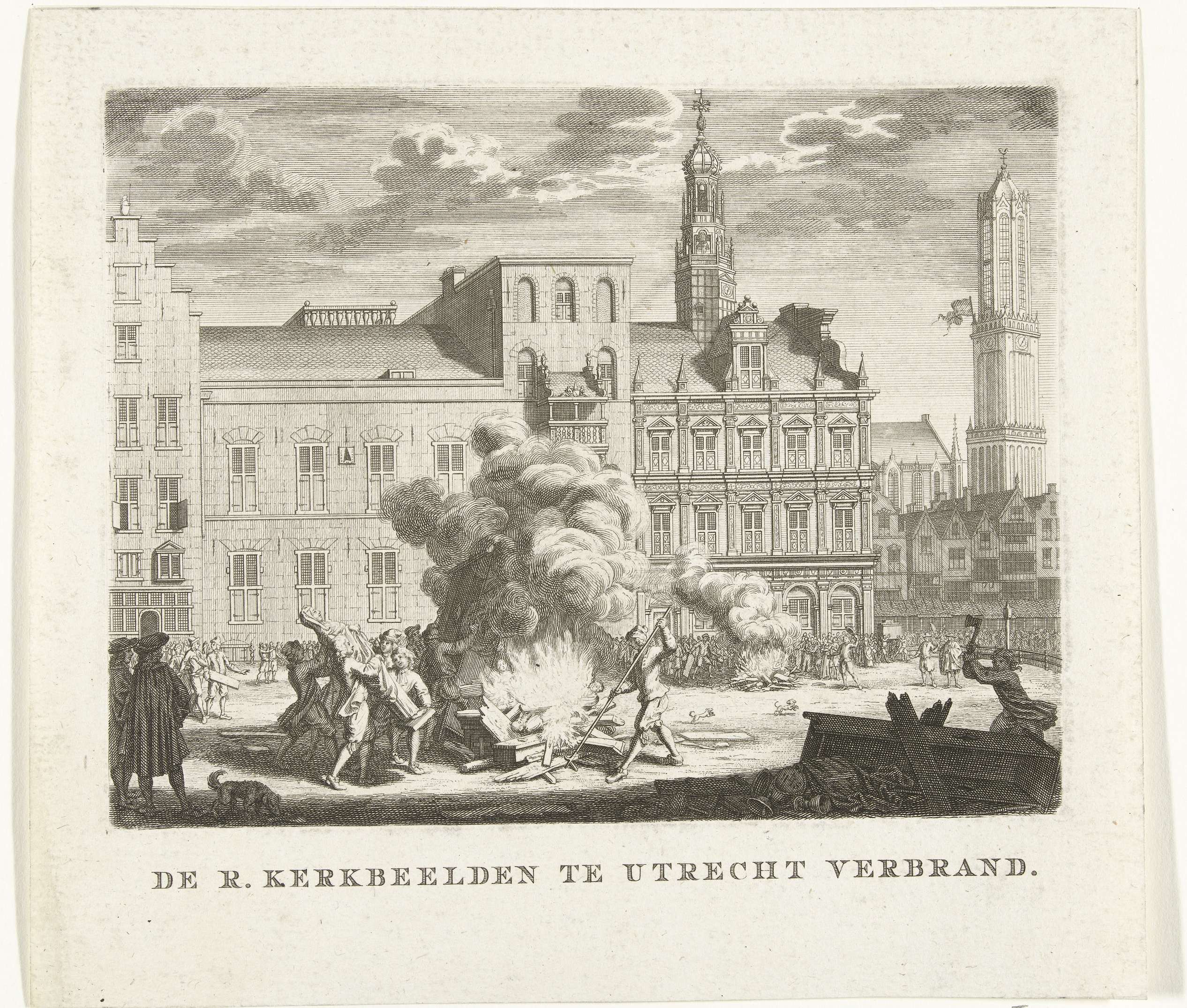 Het verbranden van de roomse beelden na het vertrek van het Franse leger uit Utrecht, 1673
