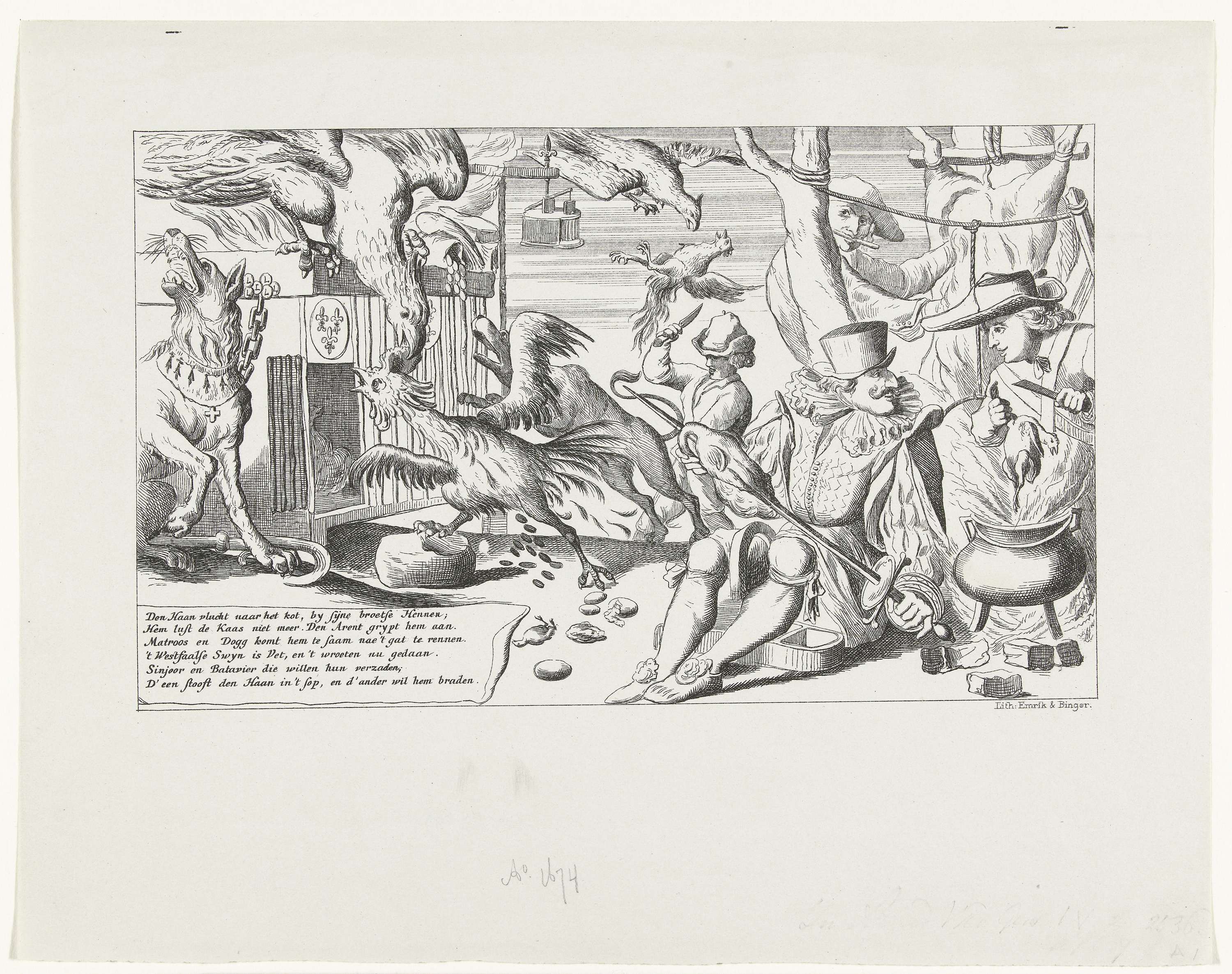Reproductie van een spotprent op de Fransen na het sluiten van de vrede tussen de Republiek en Engeland, 1674. Een vluchtende haan (Frankrijk) wordt in de kam gepikt door een adelaar (Duitsland). Rechts rijgt een Spanjaard een haan aan zijn zwaard om te braden, hierbij ook een Hollander die een haan in de kookpot stopt. ...
