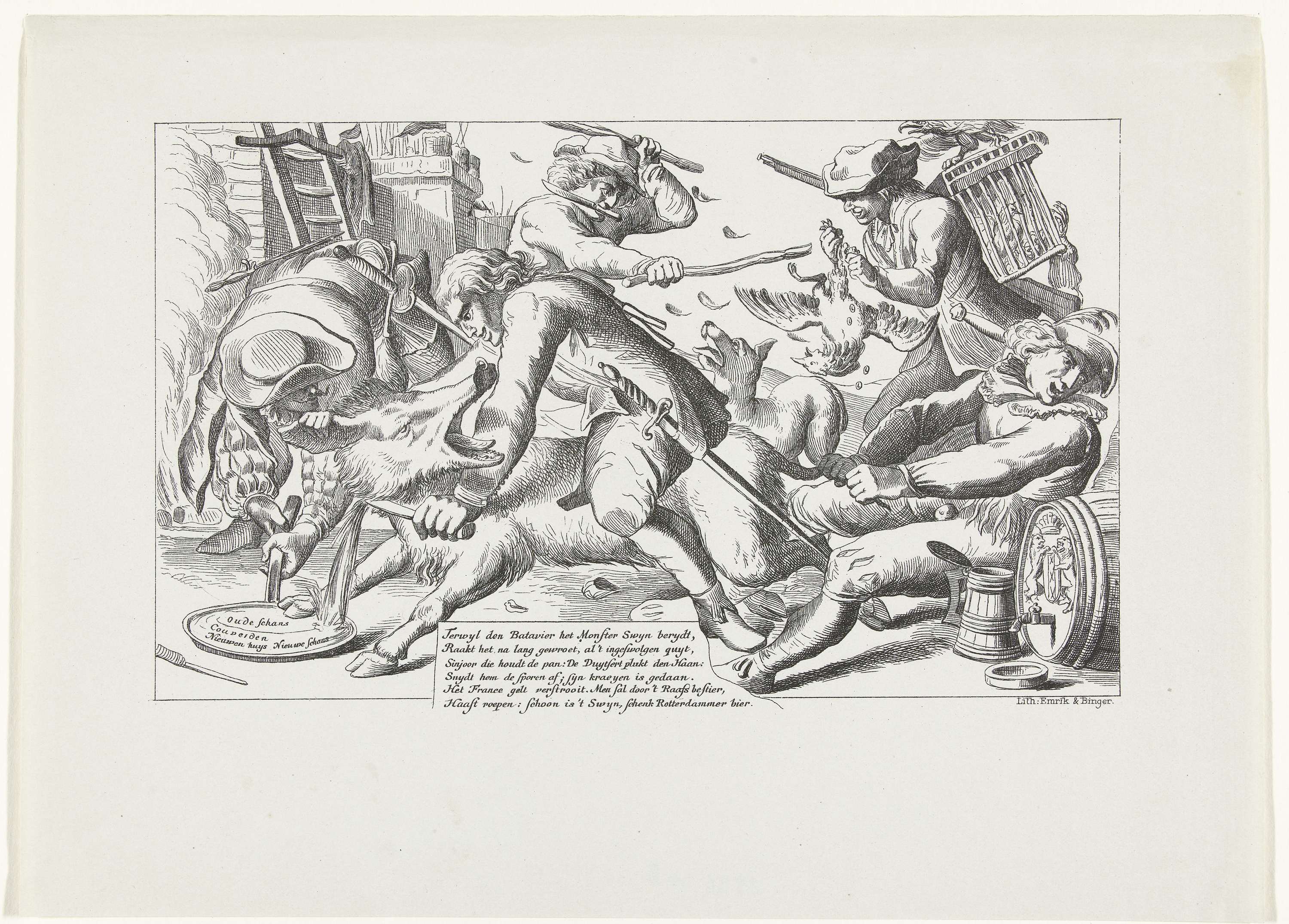 Reproductie van een spotprent op Münster (en Keulen) na het sluiten van de vrede tussen de Republiek en Engeland, 1674. Een Hollander snijdt een zwijn (Münster) de keel door. Op de achtergrond vangt en plukt een vogelkoopman (Duitsland) de haan (Frankrijk) en wordt een wolf (Keulen) verjaagd. Middenonder een cartouche met een vers van 6 ...