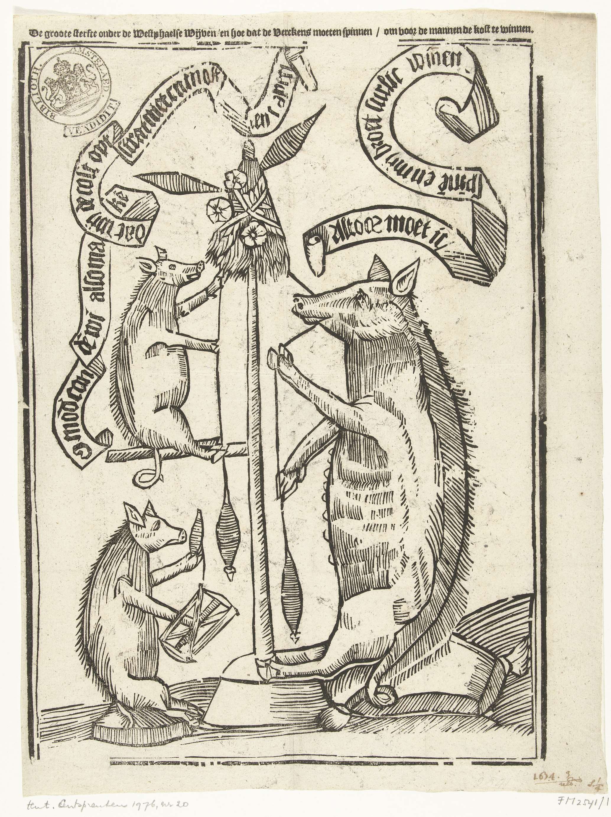 Dierenallegorie waarin varkens moeten spinnen omdat door het tekort aan vrouwen (door de oorlog van Bernard von Galen, de bisschop van Munster) in Westfalen. Met teksten in banderollen in het blok in het Nederlands.
