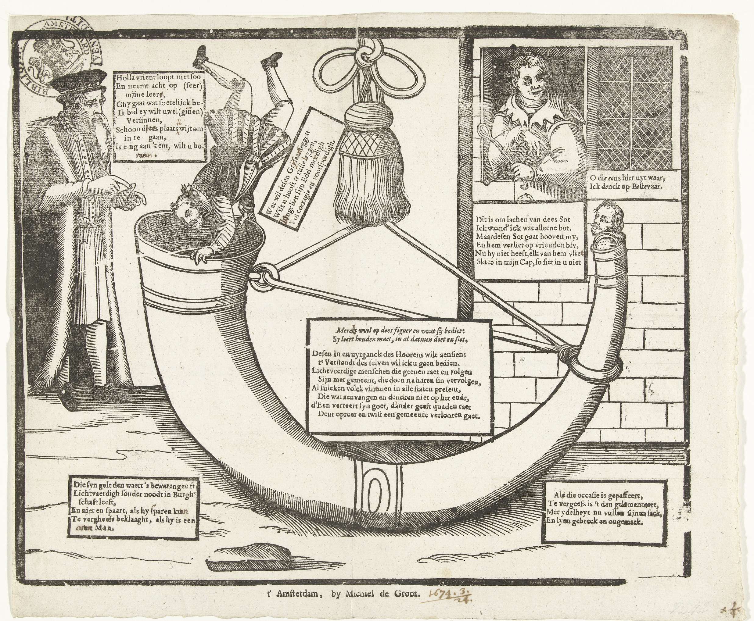 Moralistische voorstelling die weleens wordt geïnterpreteerd als een spotprent op de arminianen of op de graven van Egmond en Hoorne. Door Muller opgenomen als mogelijk een spotprent op de bisschop van Munster of prins Wilhelm von Fürstenberg, op basis van de notitie van de datum 1674 3/24 (24 maart) op de prent. Het opschrift in ...