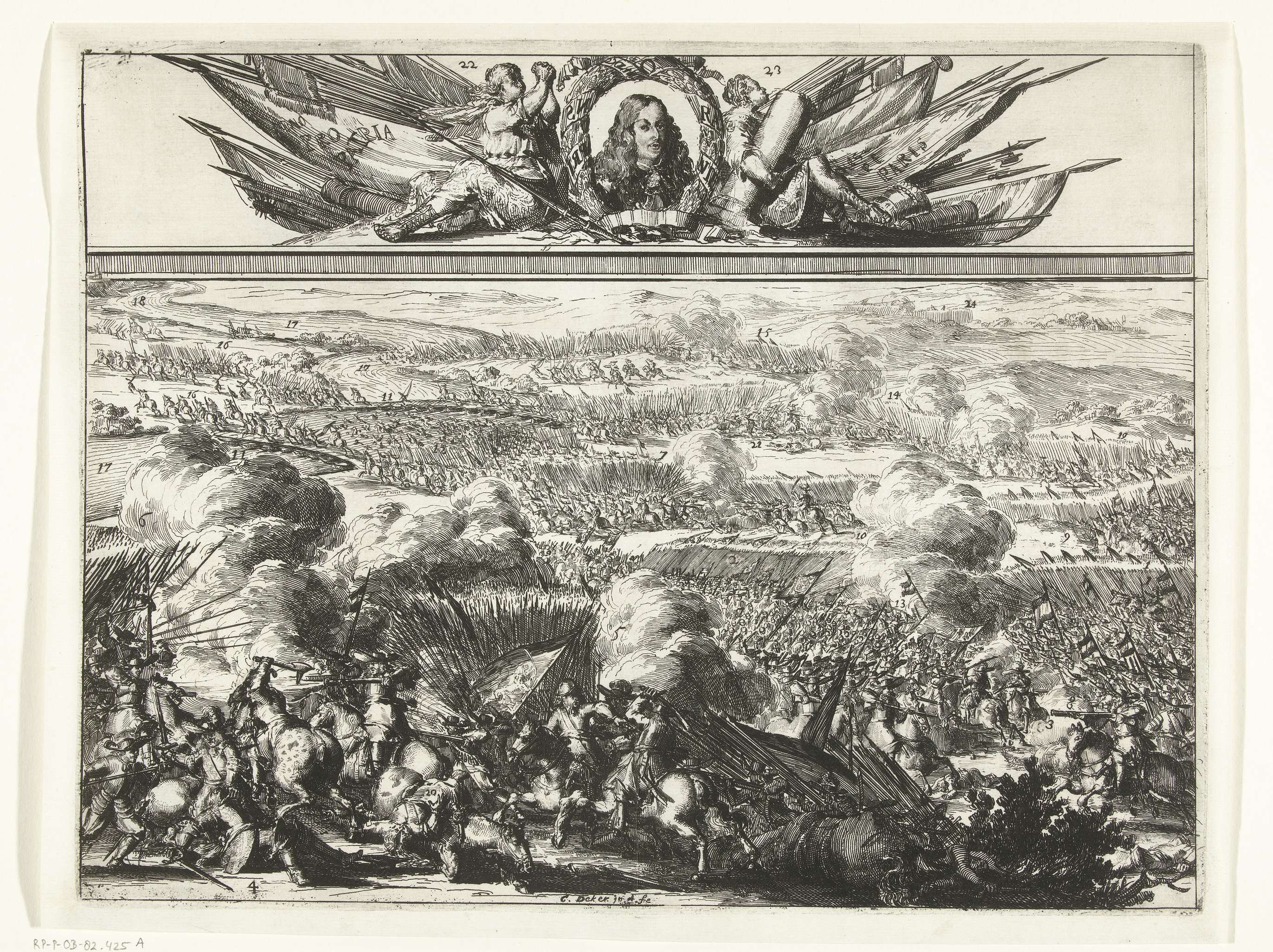 Slag bij Seneffe op 11 juli 1674 tussen de geallieerde Staatse troepen onder Willem III en de Spaanse en keizerlijke troepen enerzijds en de Fransen onder de prins van Condé anderzijds. Bovenaan een portret van Willem III tussen Voorzichtigheid (Prudentia) en Kracht (Fortitudo) en omringd met vaandels. Bij de prent behoort een tekstblad.