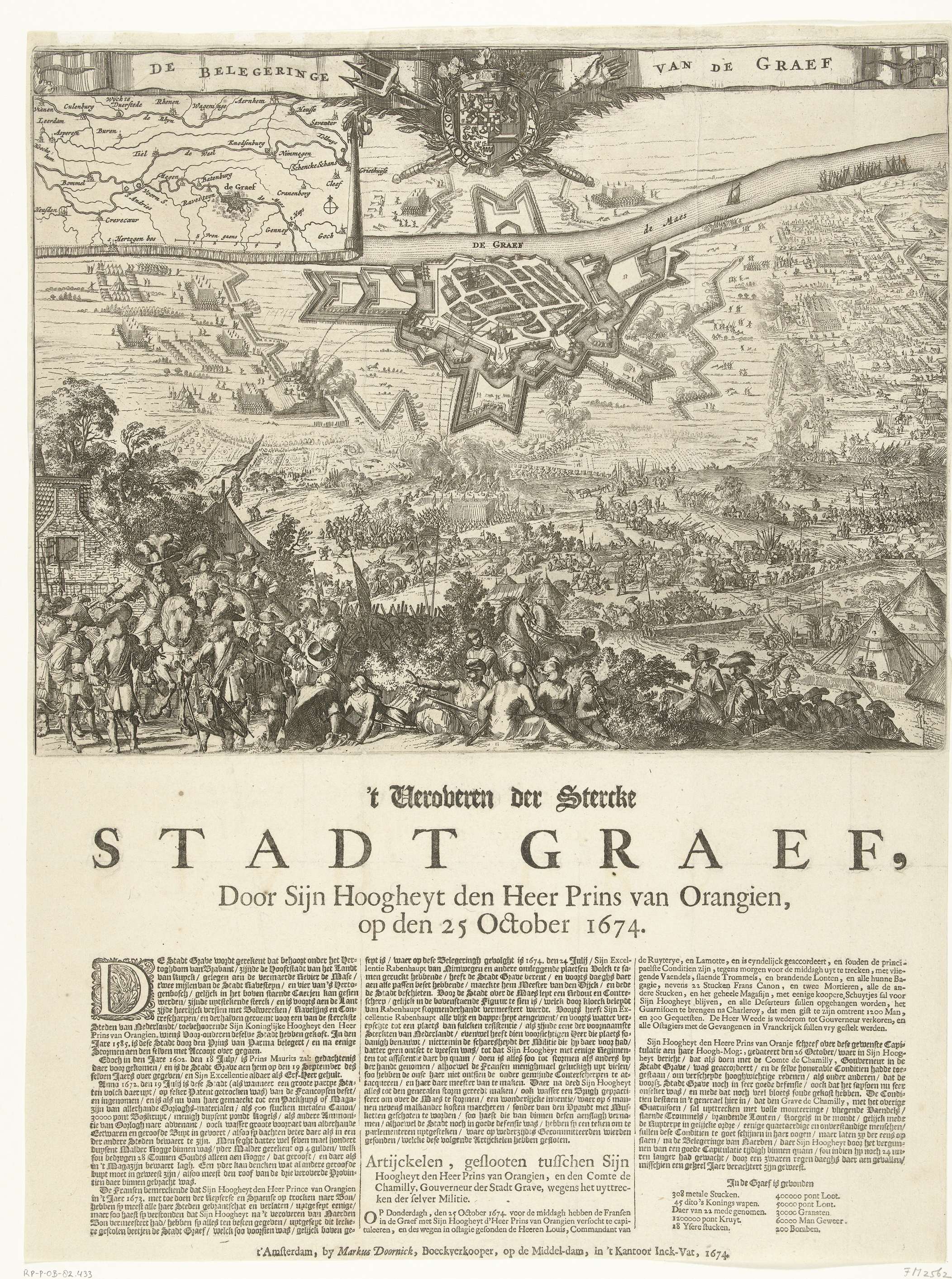 Het beleg en de verovering van Grave door Willem III, 25 juli tot 29 oktober 1674. Gezicht op de belegering van de stad in vogelvluchtperspectief. Op de voorgrond de prins met zijn staf. Bovenaan het wapen van de prins. Midden op de voorgrond een groepje buitenanders waaronder enkele zwarten. Op het blad onder de plaat ...