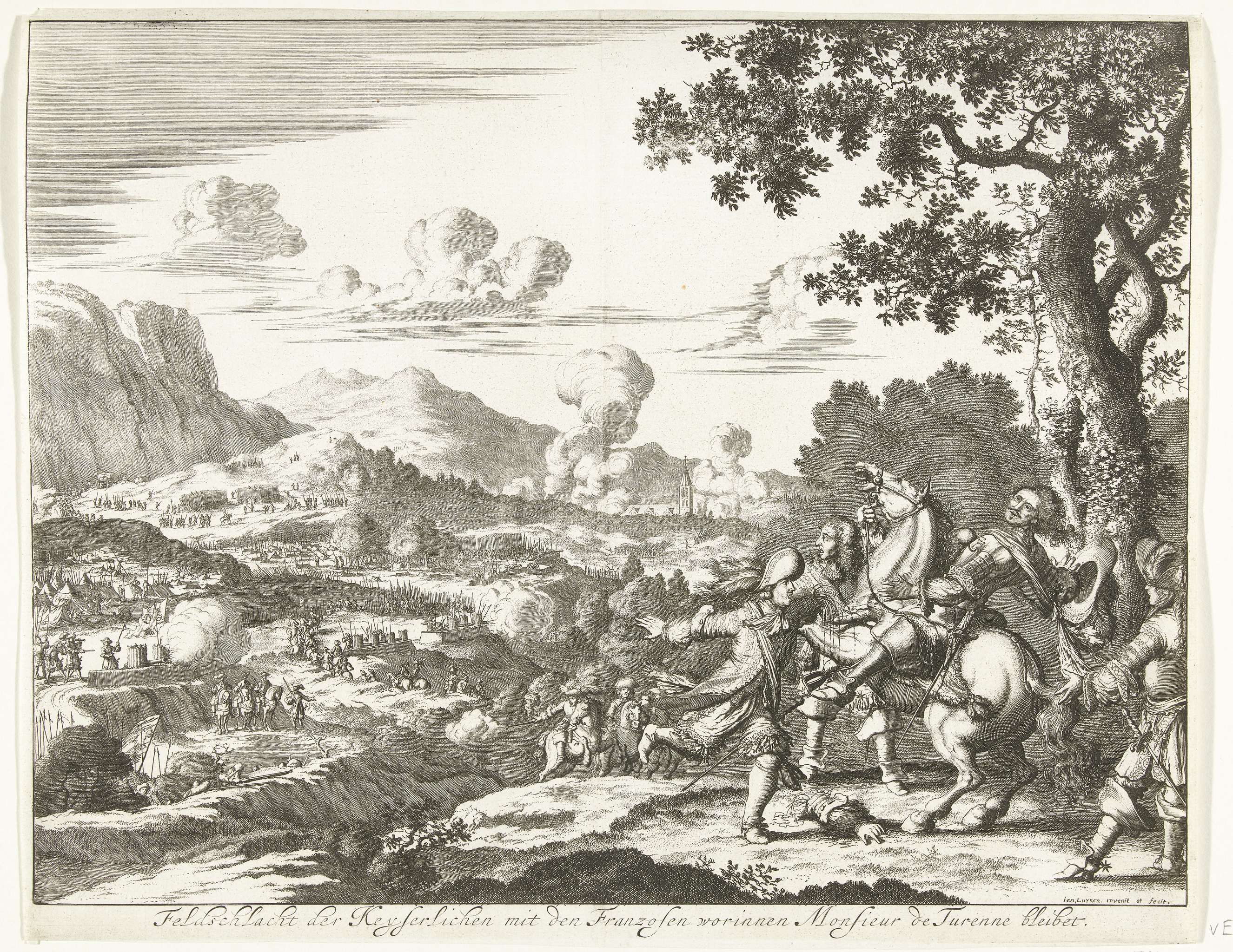 Veldslag bij Sasbach (of Salzbach of Rosentach) tussen het keizerlijke leger en het Franse leger, 27 juli 1675. Bij de slag komt maarschalk Turenne om het leven. Turenne wordt zittend op zijn paard door een kogel getroffen.