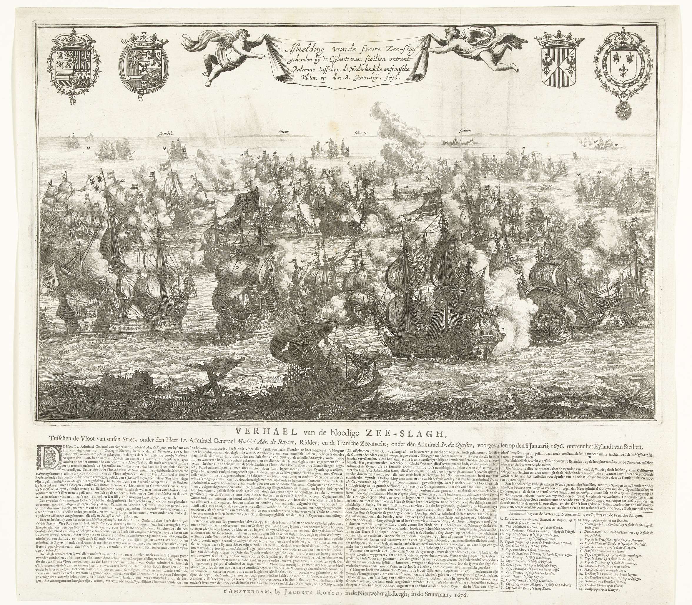 Zeeslag bij Stromboli op 8 januari 1676 tussen de vloot van de Republiek onder Michiel Adriaenszoon de Ruyter en een Franse vloot onder Abraham Duquesne. Bovenaan de wapens van de Spaanse koning Karel II, prins Willem III en Frankrijk. Gedrukt onder de plaat een tekst in 4 kolommen met de legenda's A-S en 1-16 in ...