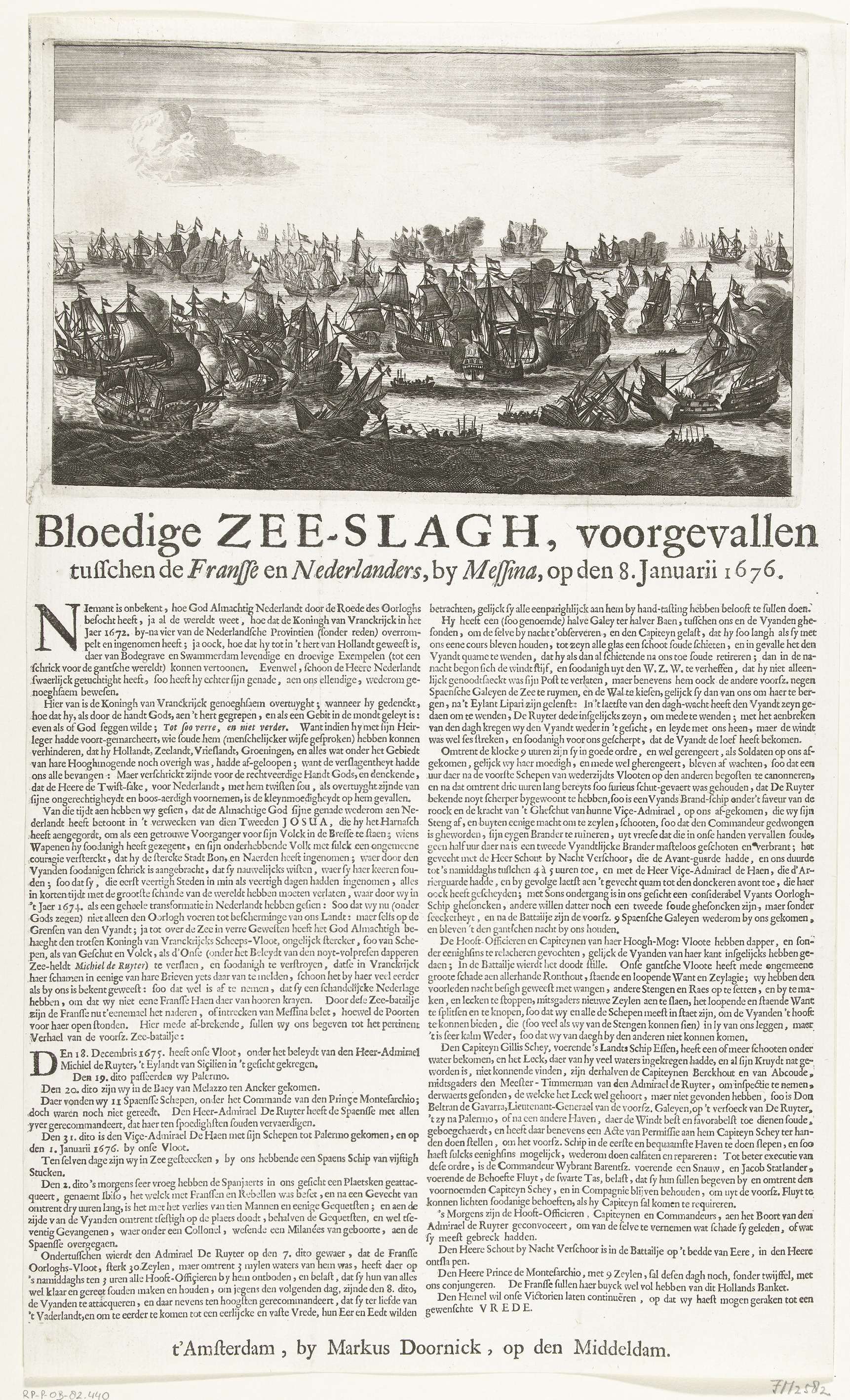 Zeeslag bij Stromboli op 8 januari 1676 tussen de vloot van de Republiek onder Michiel Adriaenszoon de Ruyter en een Franse vloot onder Abraham Duquesne. Gedrukt onder de plaat een tekst in 2 kolommen in het Nederlands.