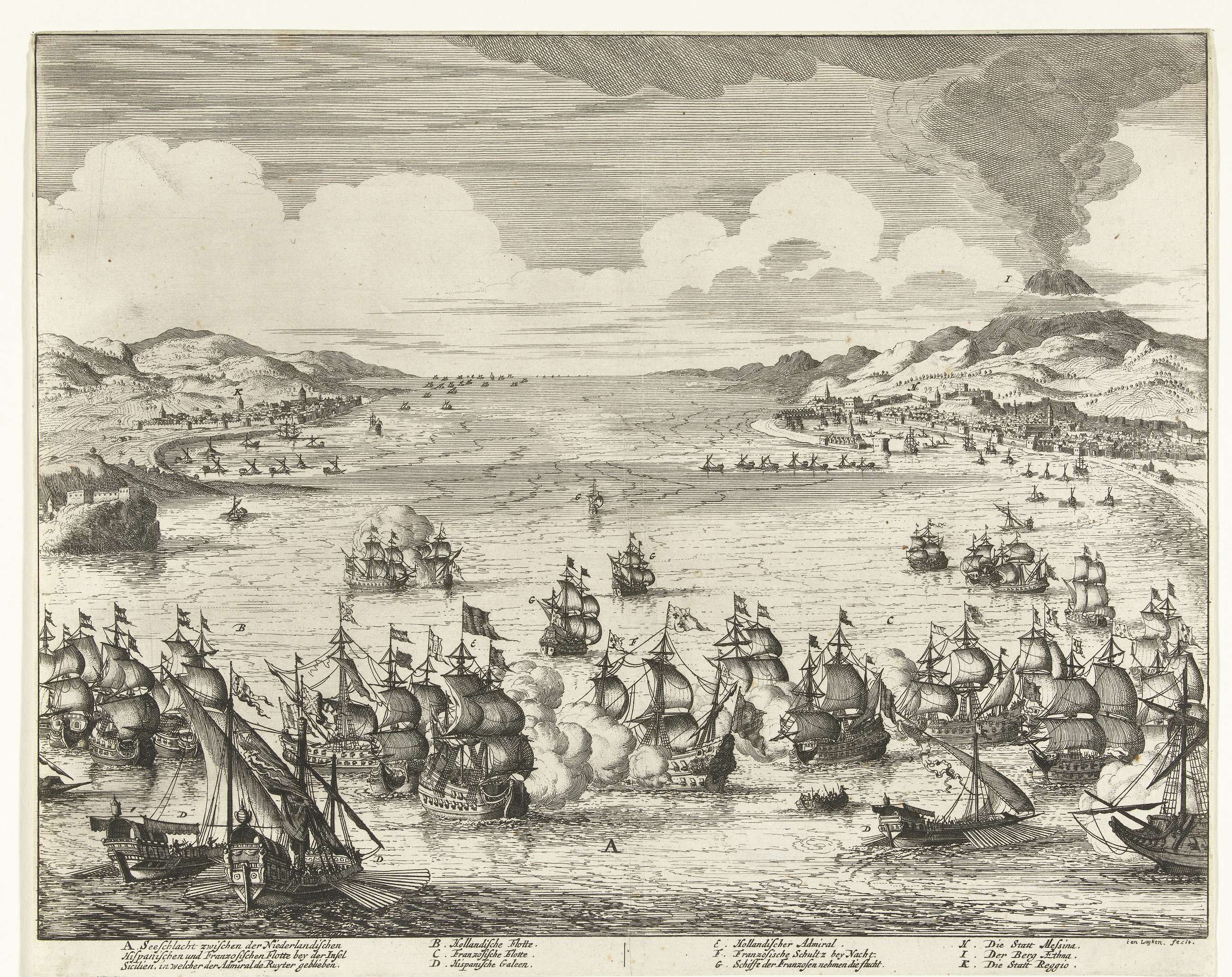Zeeslag bij Agosta op 22 april 1676 tussen een gecombineerd Hollands-Spaanse vloot onder Michiel Adriaenszoon de Ruyter en een Franse vloot onder Abraham Duquesne. De Ruyter raakt bij dit gevecht dodelijk gewond. Op de achtergrond rechts Messina en de vulkaan Etna. In het onderschrift de legenda A-K in het Duits.