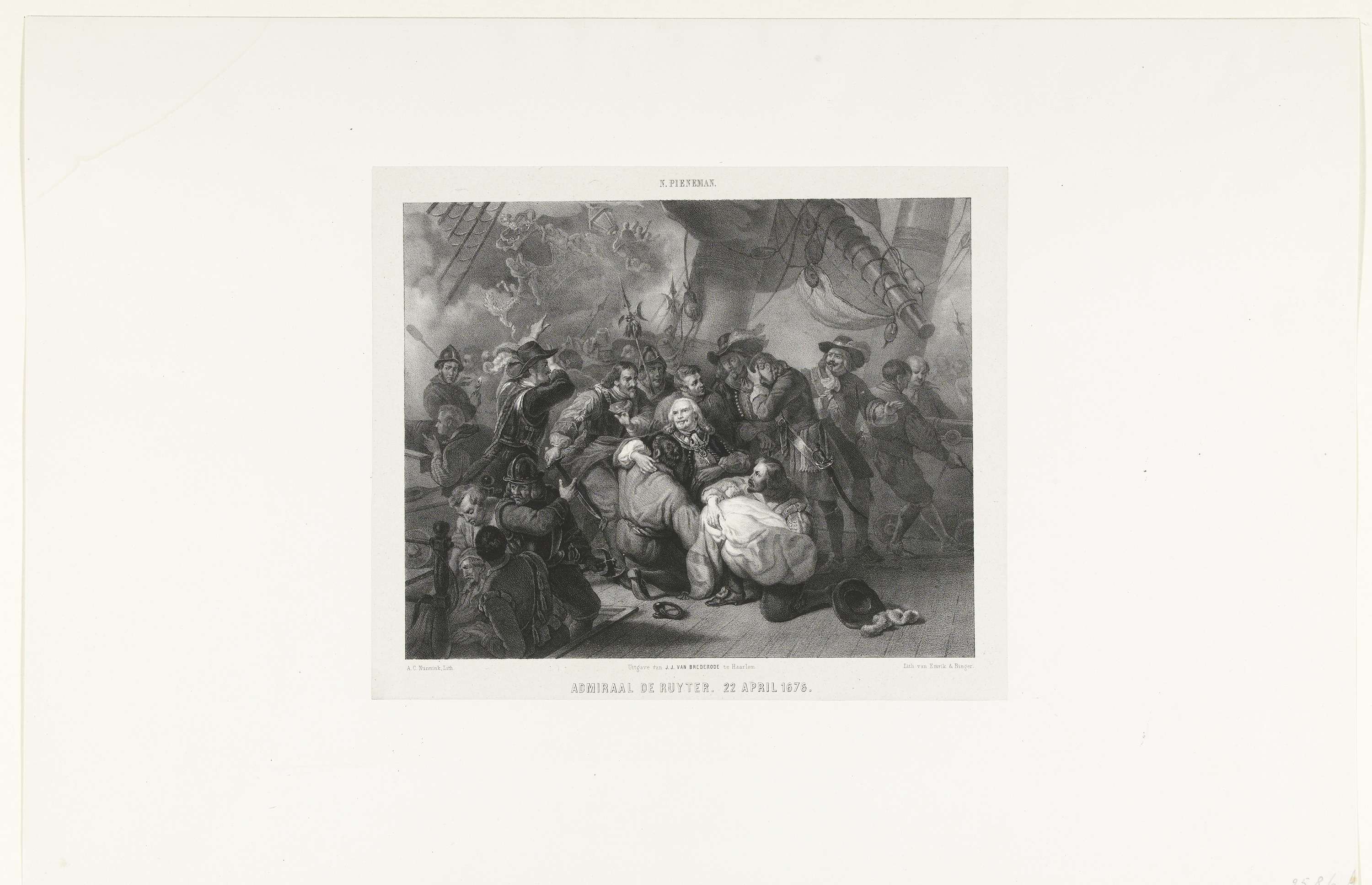 Admiraal Michiel Adriaenszoon de Ruyter raakt dodelijk gewond tijdens de zeeslag bij Agosta op 22 april 1676 tussen een gecombineerd Hollands-Spaanse vloot onder De Ruyter en een Franse vloot onder Abraham Duquesne. In alle hevigheid van de slag wordt De Ruyter wordt door zijn bemanning in een laken gewikkeld en naar zijn kajuit gedragen.