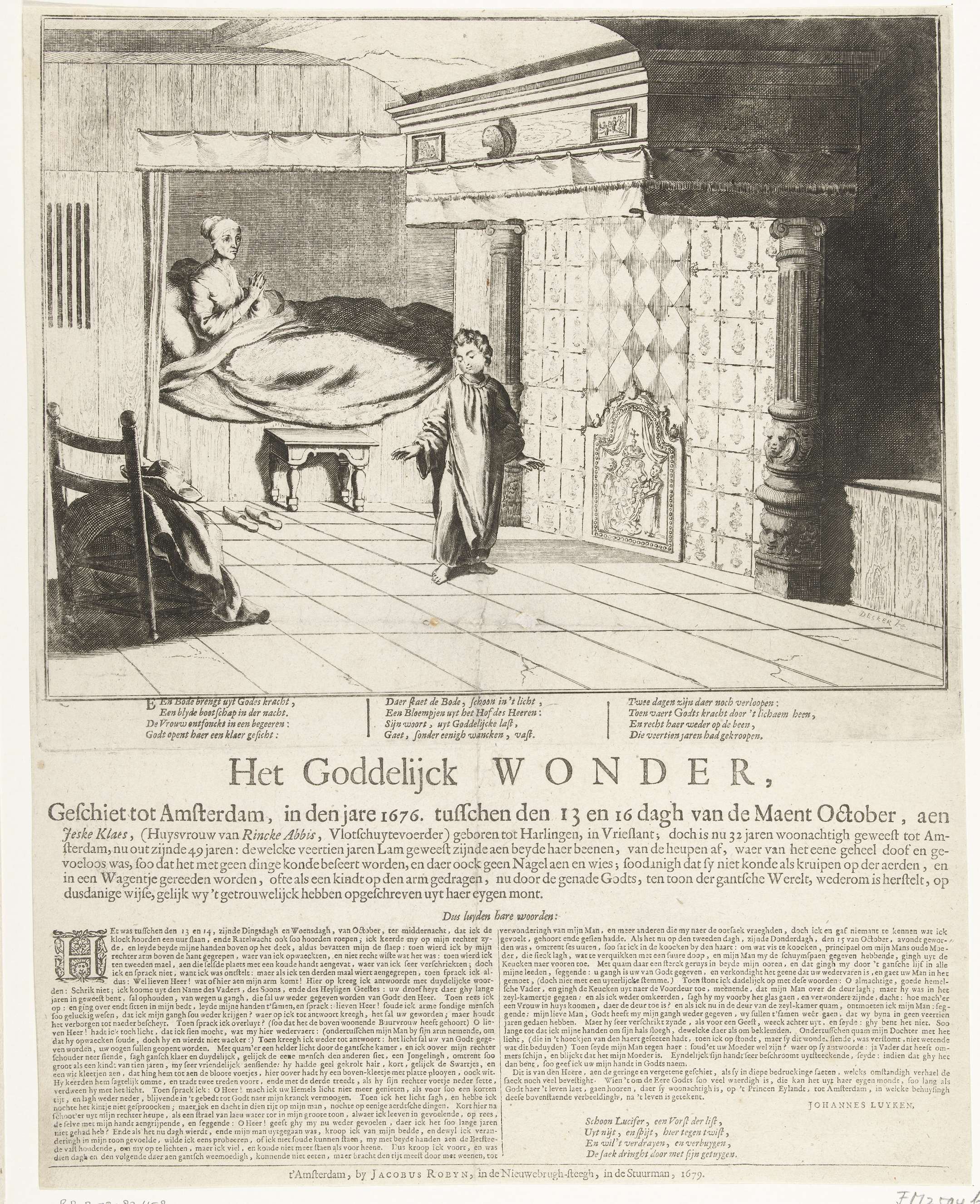 De wonderbaarlijke genezing van Jeske Klaes, geschiedt tussen 13-16 oktober 1676 te Amsterdam. De vrouw zit overeind in haar bedstee en dankt de engel, in de vom van een jongen van ca. 10 jaren oud, voor de genezing van haar verlamde benen. In de plaat 3 verzen van 4 regels, daaronder op het blad een ...
