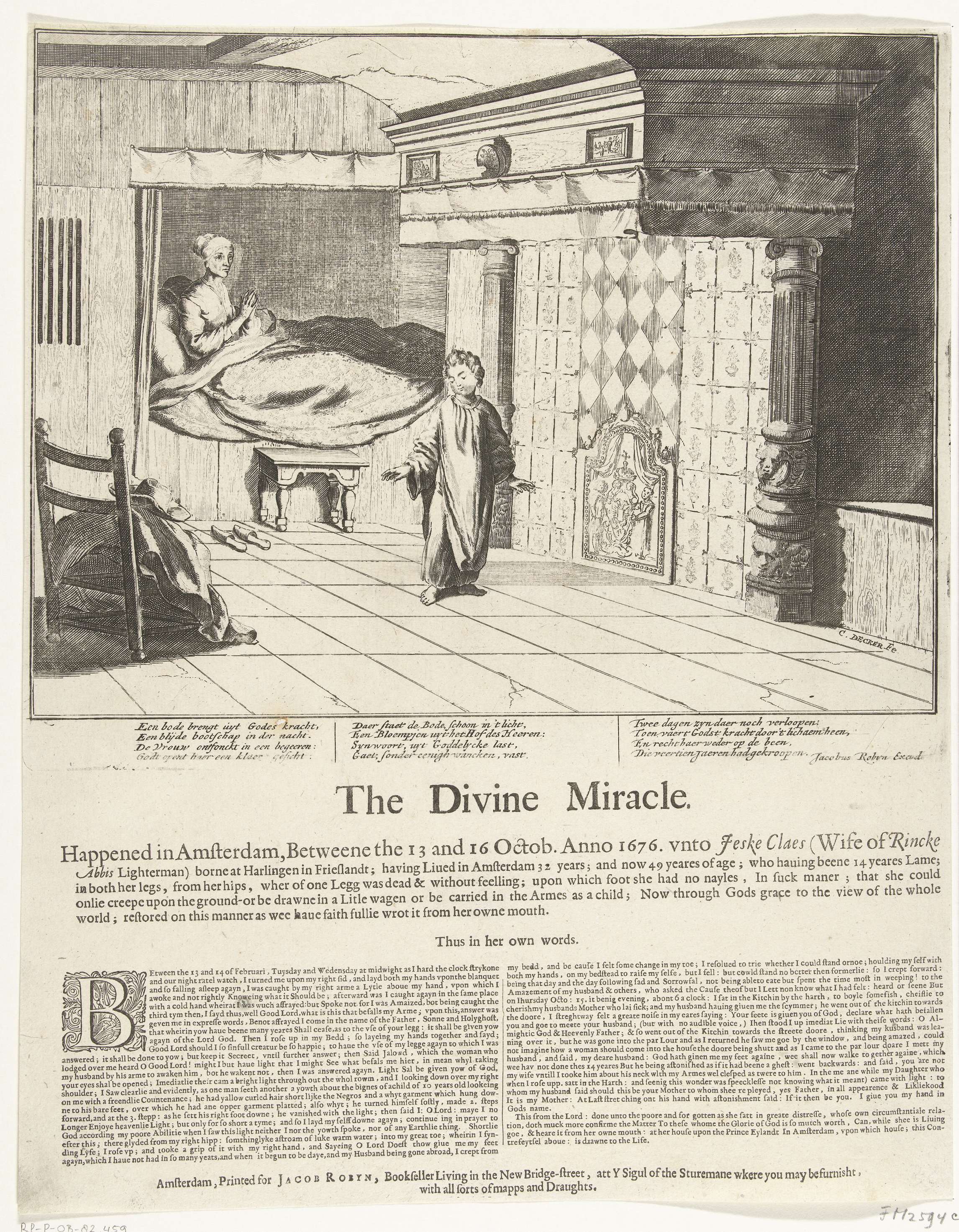 De wonderbaarlijke genezing van Jeske Klaes, geschiedt tussen 13-16 oktober 1676 te Amsterdam. De vrouw zit overeind in haar bedstee en dankt de engel, in de vom van een jongen van ca. 10 jaren oud, voor de genezing van haar verlamde benen. In de plaat 3 verzen van 4 regels, daaronder op het blad een ...