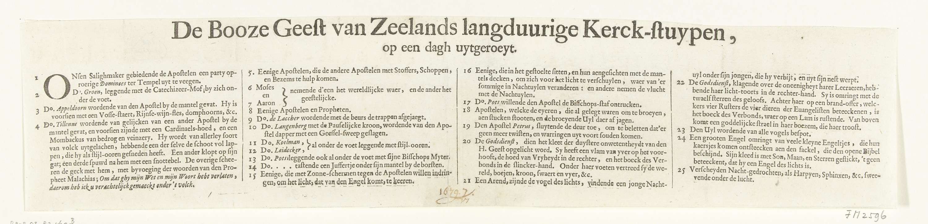 Tekstblad bij de prent over de interventie van Christus in de strijd tussen de coccejanen en voetianen in Zeeland in 1676. Tekst met de legenda 1-25 in 4 kolommen.