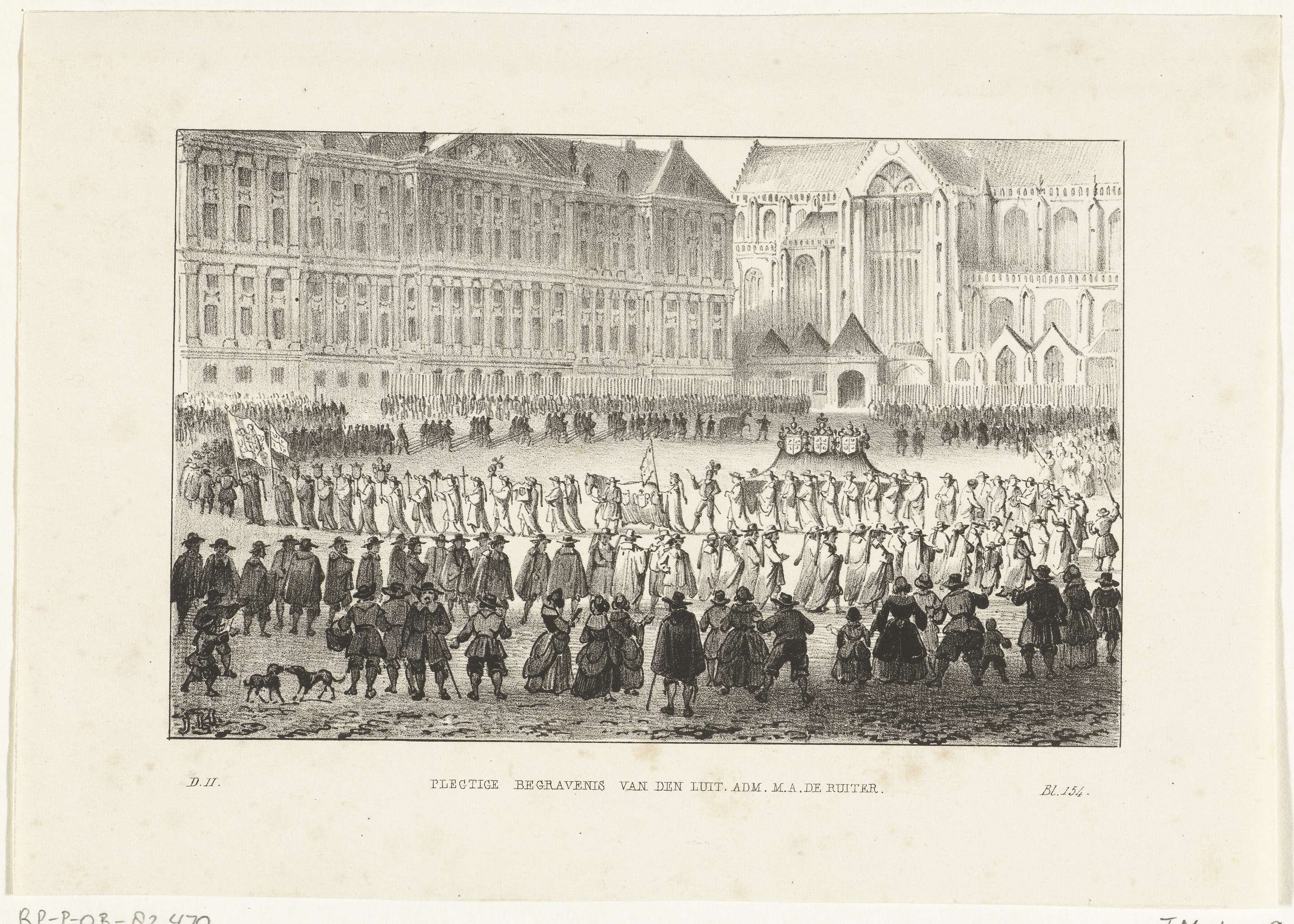 De begrafenisstoet van Michiel Adriaenszoon de Ruyter op 18 maart 1677. De begrafenisstoet gaande over de Dam langs het stadhuis naar de Nieuwe Kerk te Amsterdam. Gemrkt onderaan: D. II / Bl. 154.