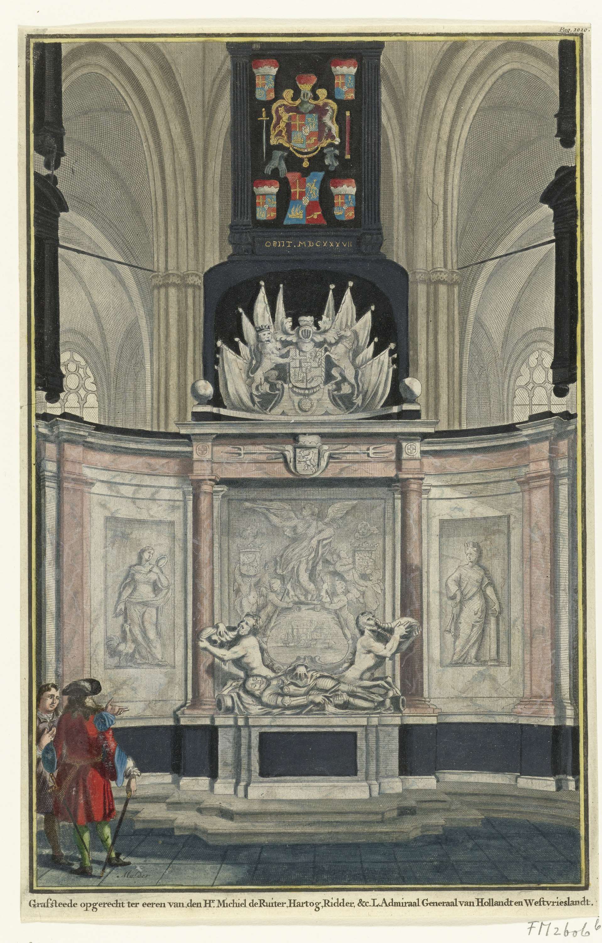 Het praalgraf van Michiel Adriaenszoon de Ruyter in het koor van de Nieuwe Kerk te Amsterdam. De luitenant-admiraal-generaal van Holland en West-Friesland werd er op 18 maart 1677 begraven. Links twee bezoekers. Rechtsboven gemerkt: Pag. 1010.