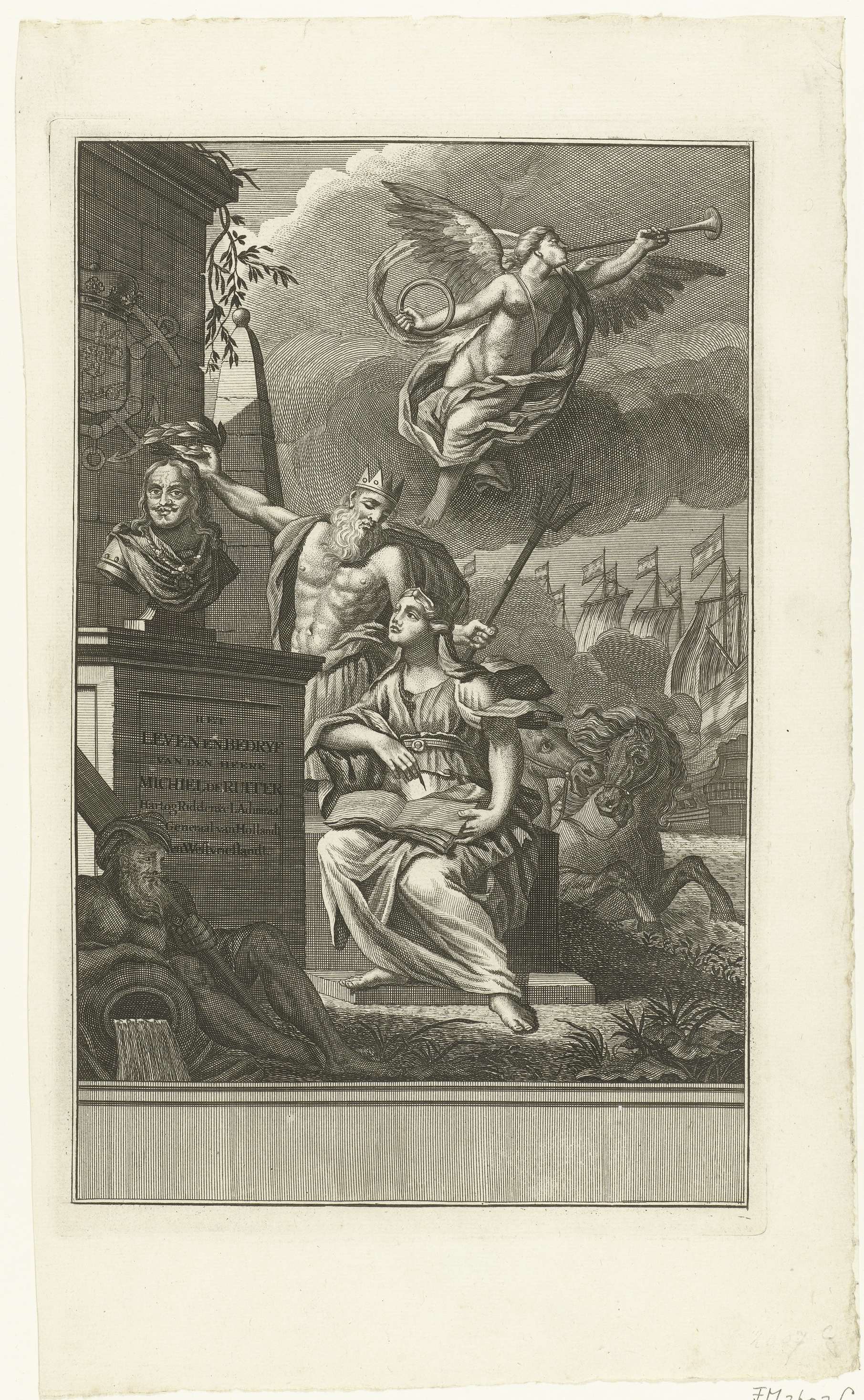 Titelpagina voor een uitgave van: G. Brandt, Het leven en bedryf van den heere Michiel de Ruiter. Allegorische titelpagina met Neptunus, Geschiedenis en Faam bij een monument voor Michiel Adriaenszoon de Ruyter.
