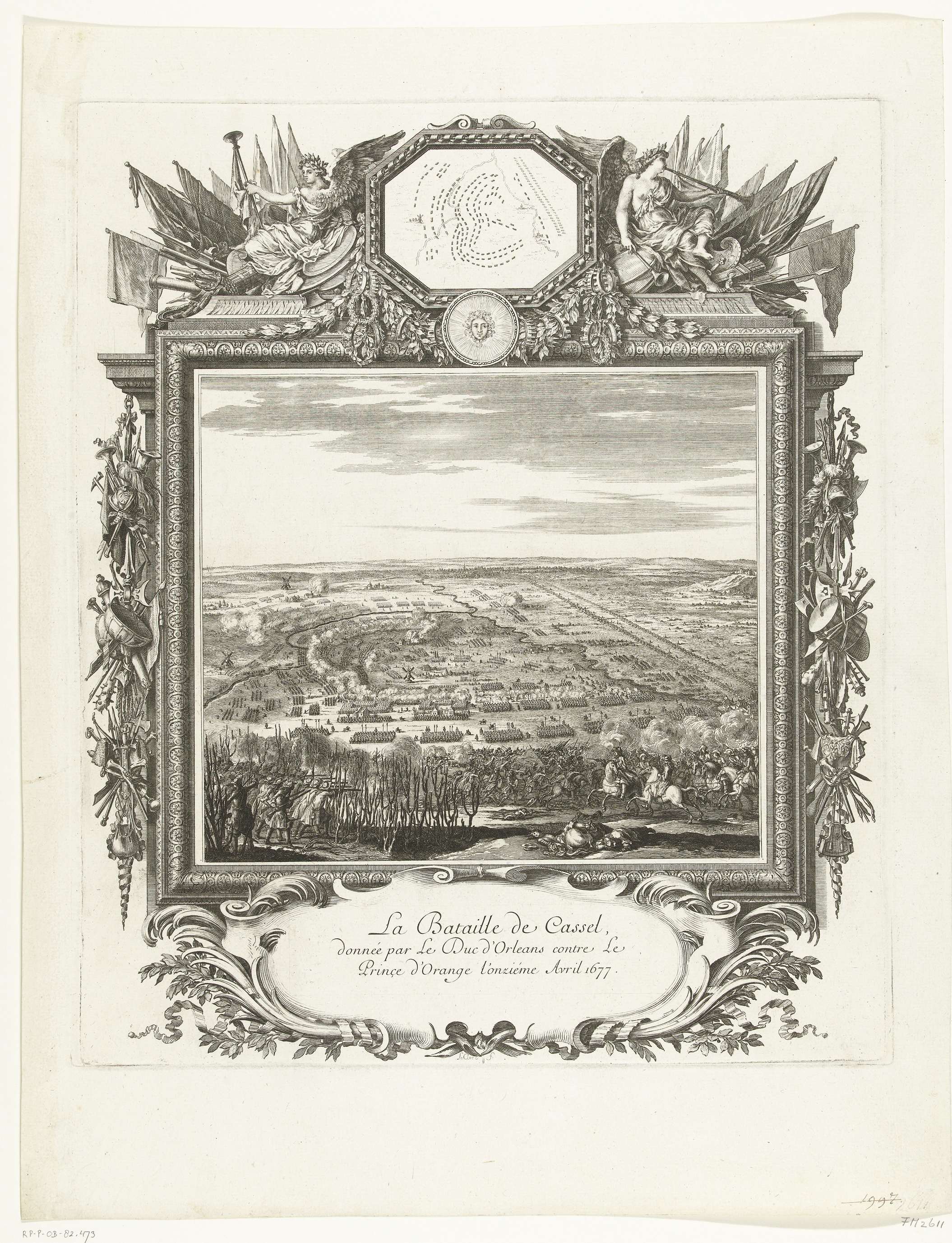 Slag bij Kassel op 11 april 1677 tussen het Franse leger onder Filips I de hertog van Orleans en de prins van Oranje. De veldslag gezien van bovenaf. De prent maakt deel uit van een Franse reeks van 28 prenten met de veroveringen van de Franse koning Lodewijk XIV tussen 1672 en 1678 getiteld: Grandes ...