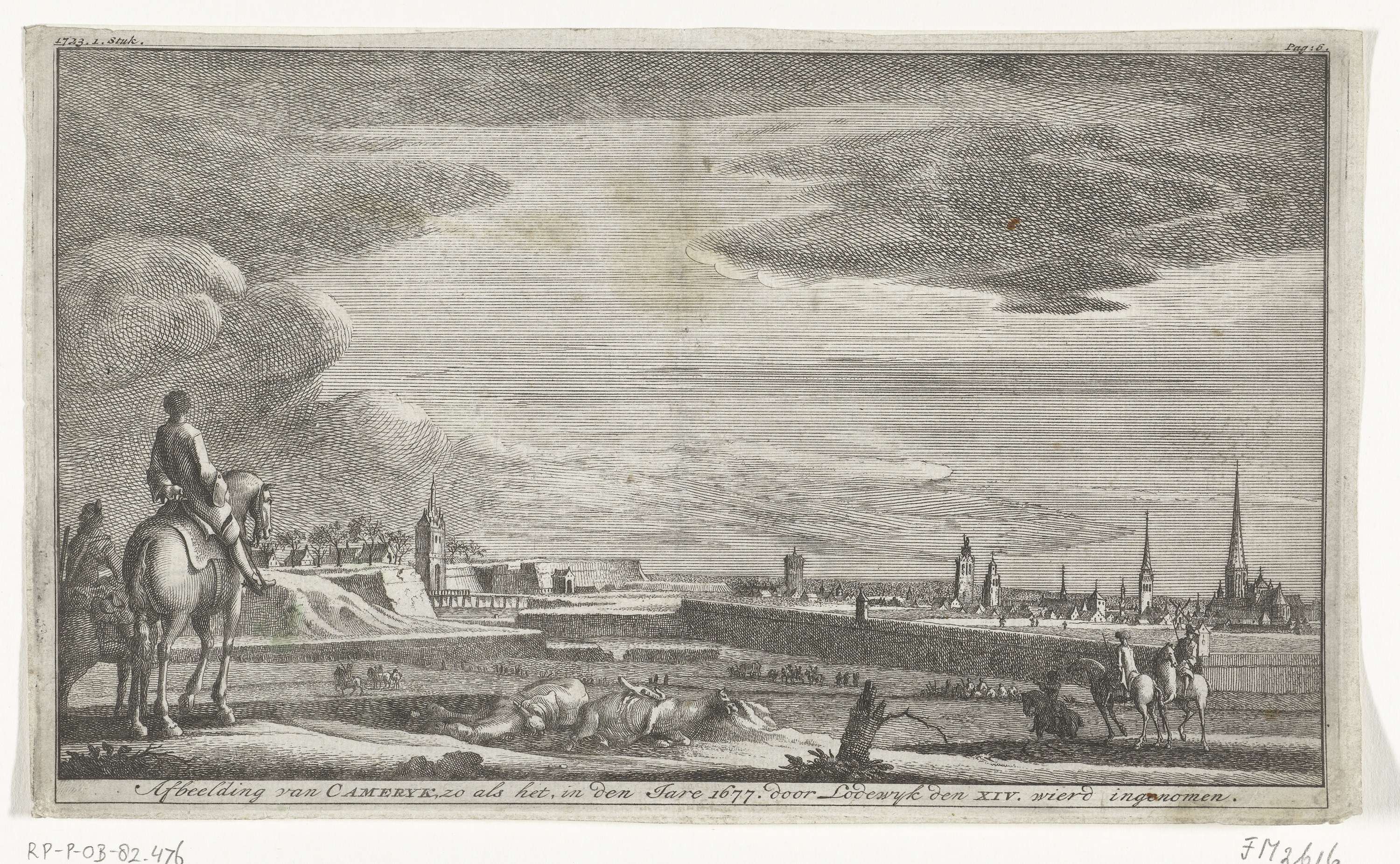 Gezicht op Kamerijk, ingenomen door het Franse leger onder Lodewijk XIV, april 1677. Op de voorgrond enkele ruiters, op de grond de kadavers van enkele omgekomen paarden. Gemerkt linksboven: 1723. 1. stuk, rechtsboven: Pag: 6.