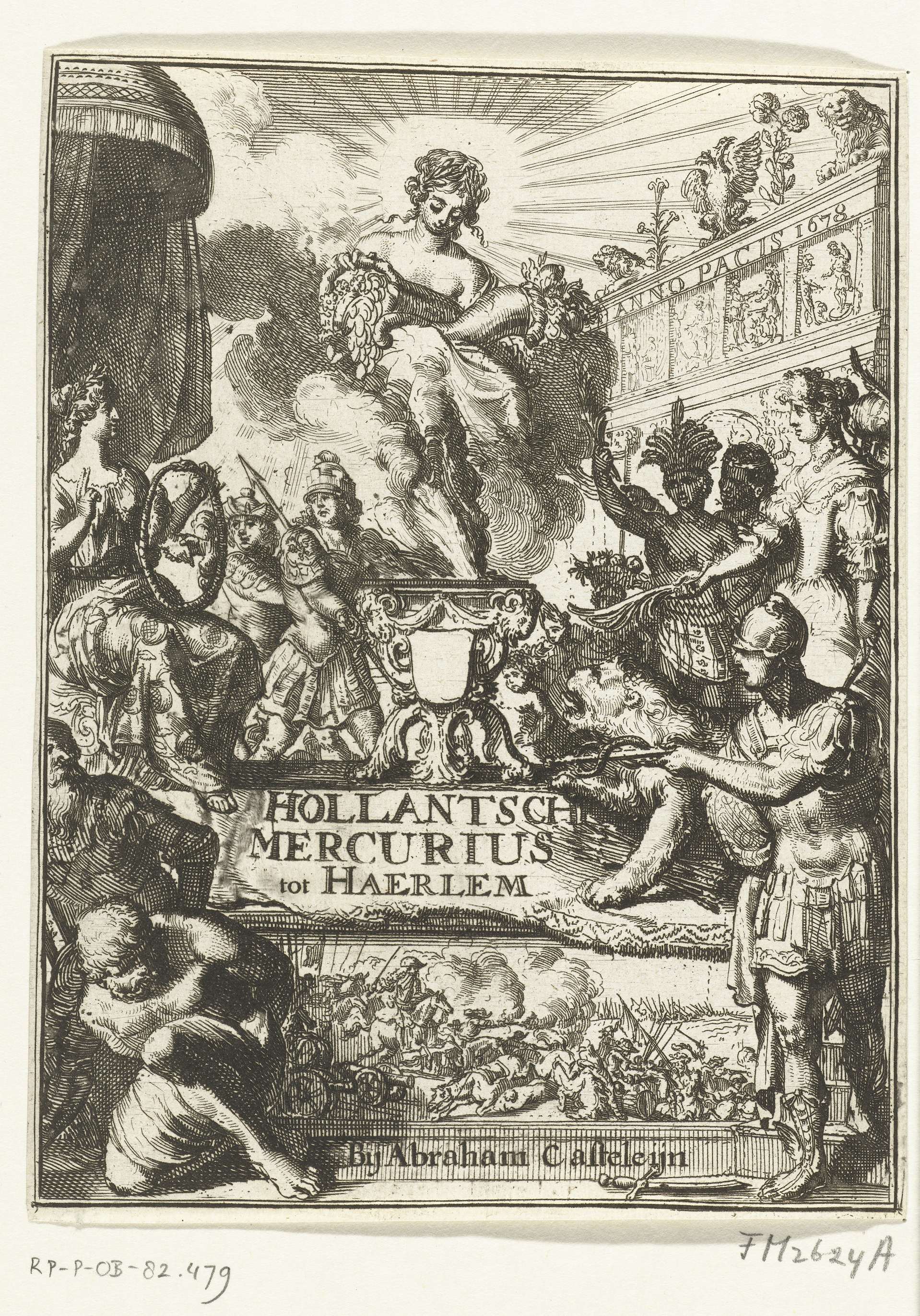 Titelpagina voor de Hollandsche Mercurius over het jaar 1678. In de wolken de Overvloed, linksvoor een geknechte gevangene, rechts Mercurius. Op de achtergrond een fries met opschrift verwijzend naar de Vrede van Nijmegen in 1678.