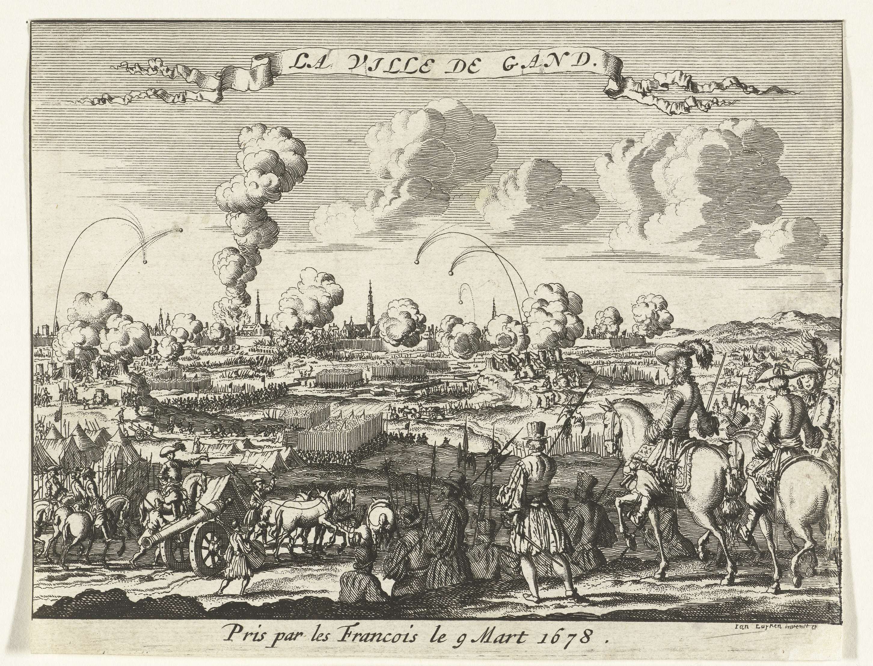 Belegering van de stad Gent door het Franse leger onder koning Lodewijk XIV. De stad werd op 9 maart 1678 ingenomen. Op de voorgrond Franse officieren te paard, in de verte Gent.