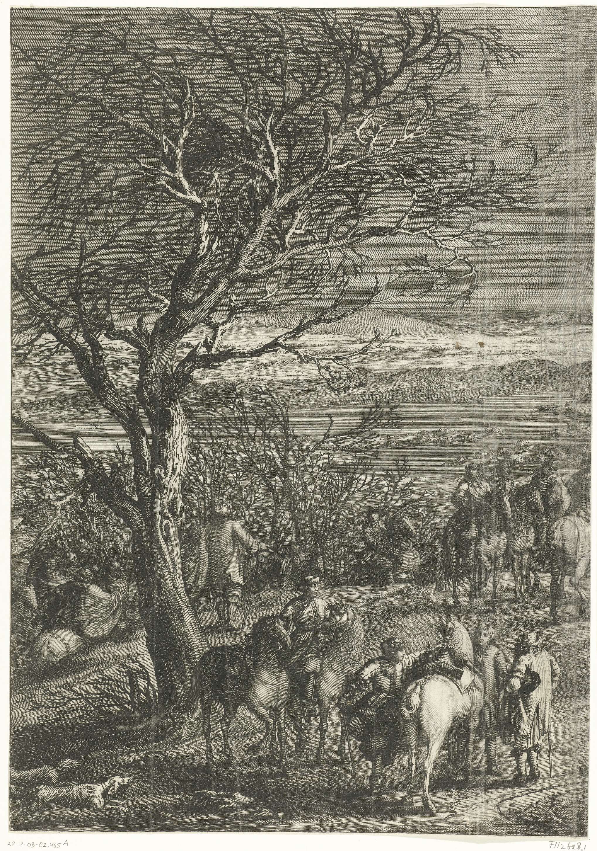 Het Franse leger onder koning Lodewijk XIV voor Yperen, op 26 maart 1678 ingenomen. Op de voorgrond officieren te paard onder bomen, in de verte Yperen. Linkerblad van een voorstelling in drie bladen.