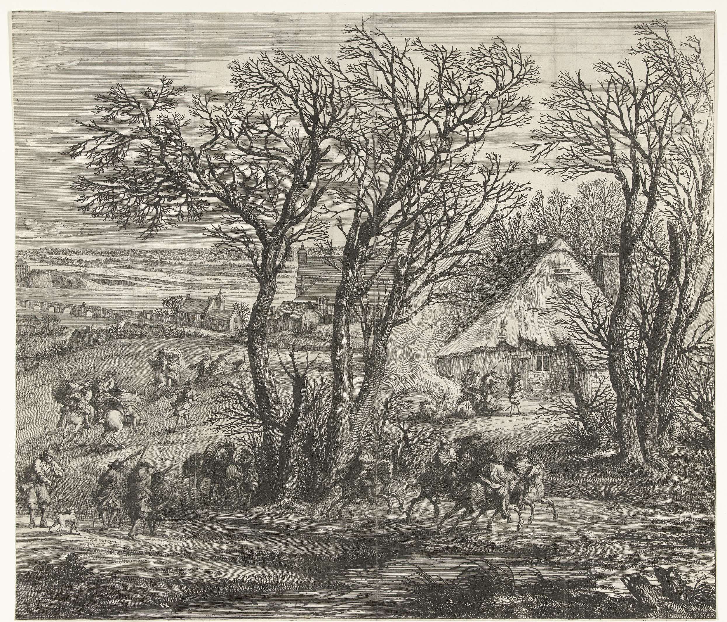 Het Franse leger onder koning Lodewijk XIV voor Yperen, op 26 maart 1678 ingenomen. Op de voorgrond officieren te paard en soldaten rond een kampvuur, in de verte Yperen. Rechterblad van een voorstelling in drie bladen.