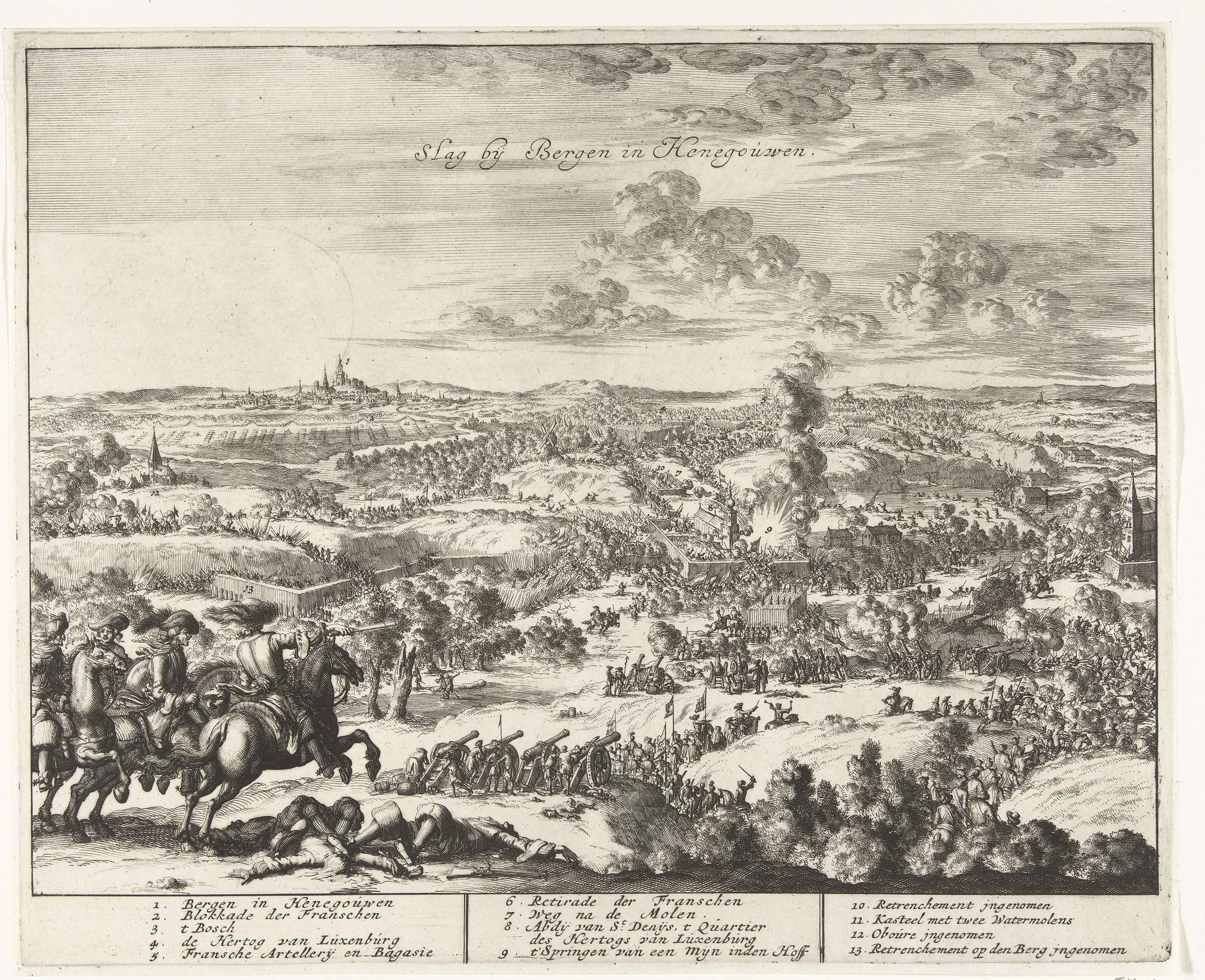 De slag bij St. Denis bij Bergen (Mons) in Henegouwen op 14 augustus 1678 tussen de prins van Oranje en de hertog van Luxemburg. In het onderschrift de legenda 1-13 in het Nederlands.