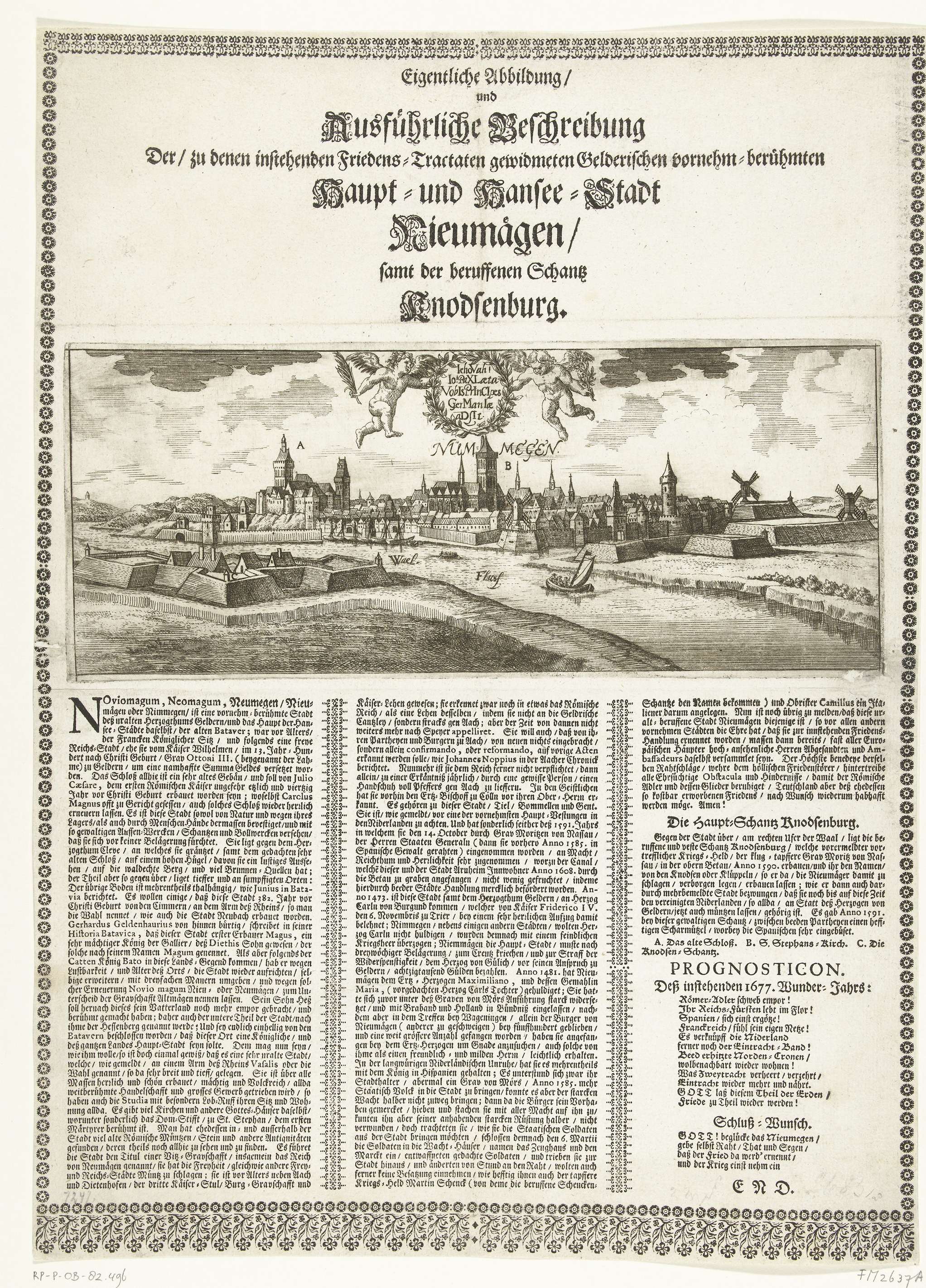 Blad met een gezicht op Nijmegen en fort Knodsenburg, in de lucht twee putti met een lauwerkrans. Onder de plaat een tekst in 3 kolommen in het Duits met de historie van Nijmegen en haar positie als onderhandelingsstad. Eindigend met de Prognosticon voor het jaar 1677.