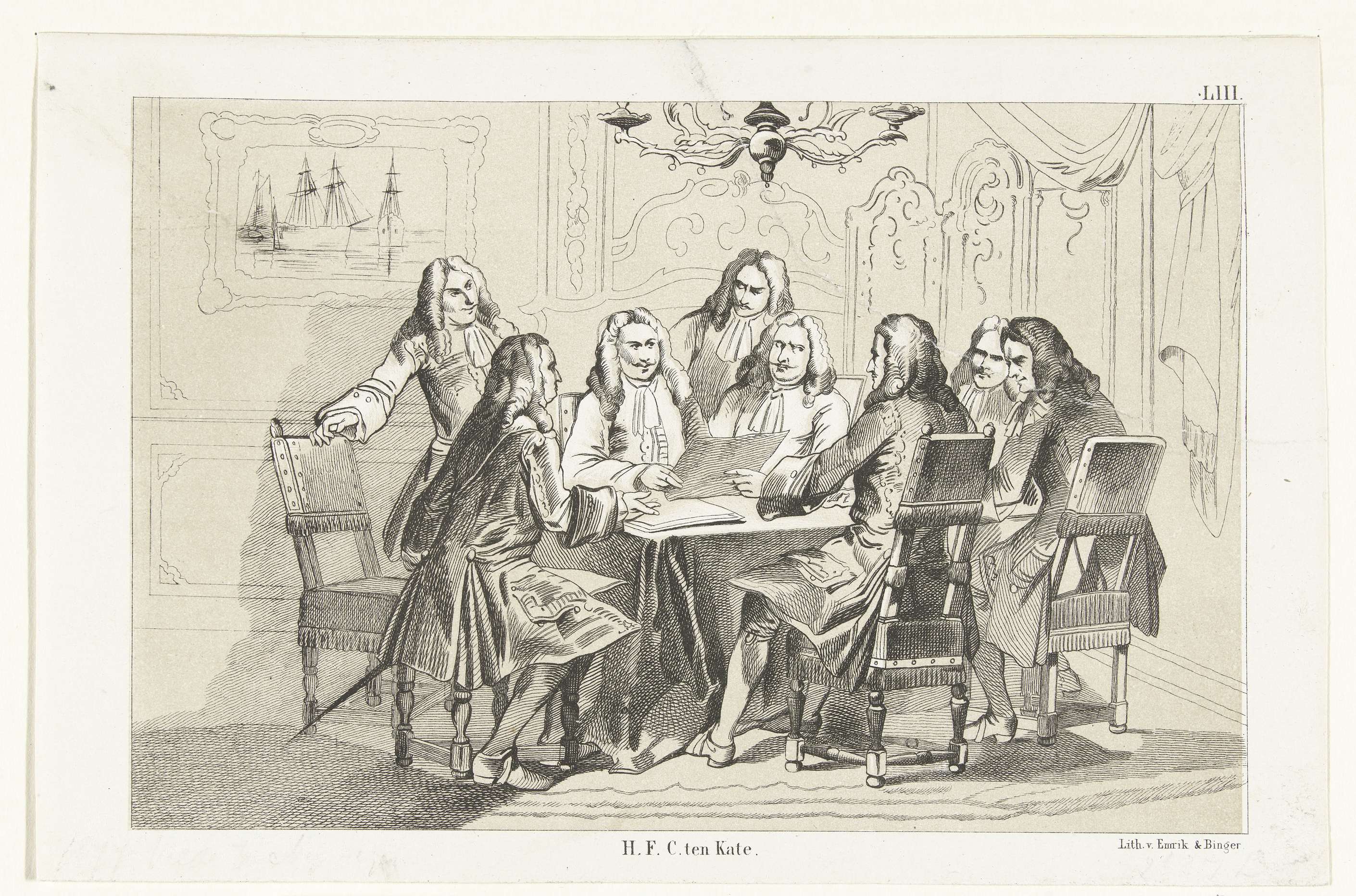 De onderhandelingen voor de Vrede van Nijmegen gesloten tussen de Republiek en Frankrijk op 10 augustus 1678. De afgevaardigden verzameld rond een tafel in een zaal. Genummerd rechtsboven: LIII.