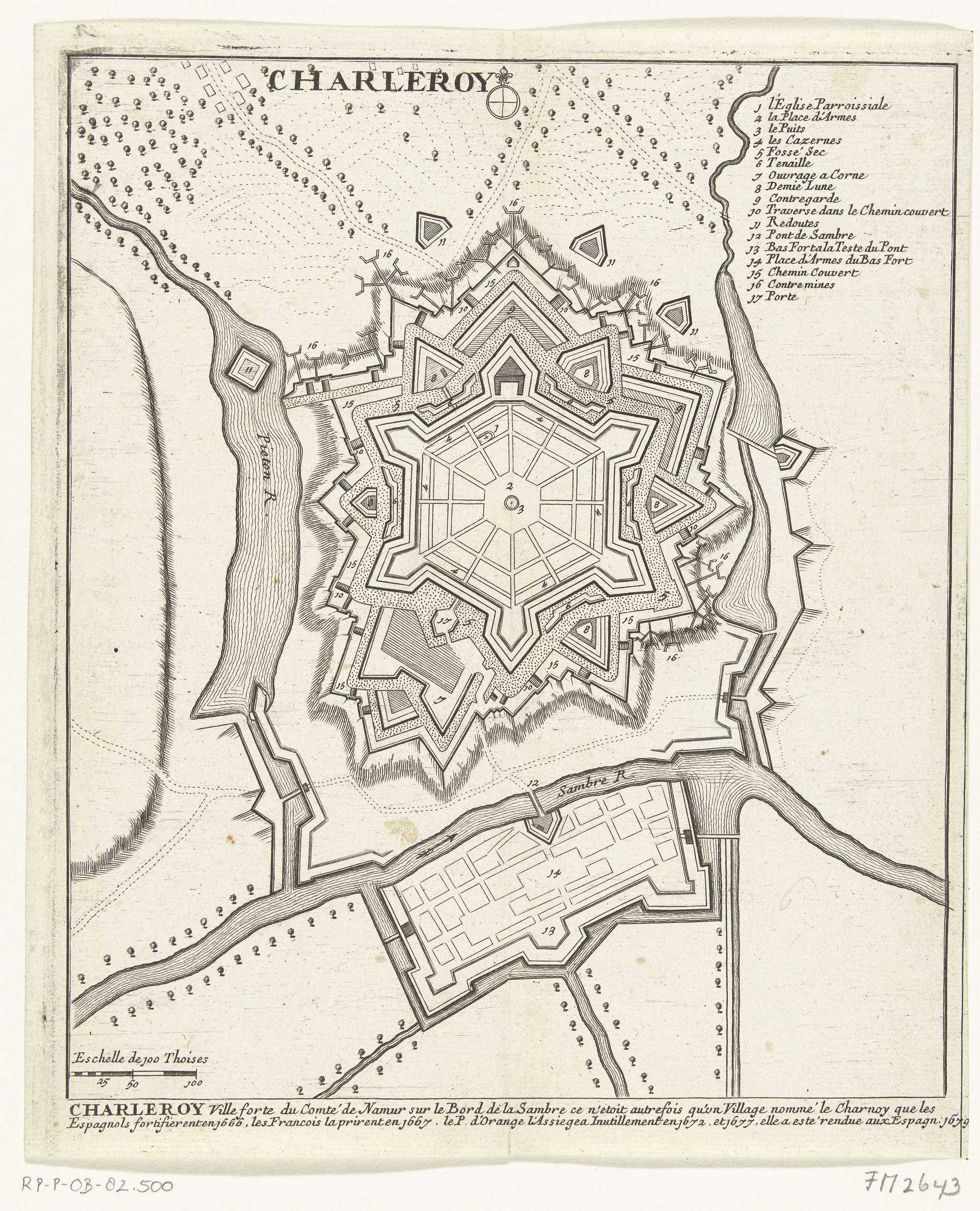 Plattegrond van Charleroi met versterkingen, in 1679 volgens de bepalingen van de Vrede van Nijmegen teruggegeven aan Spanje. Rechtsboven de legenda 1-17 in het Frans.