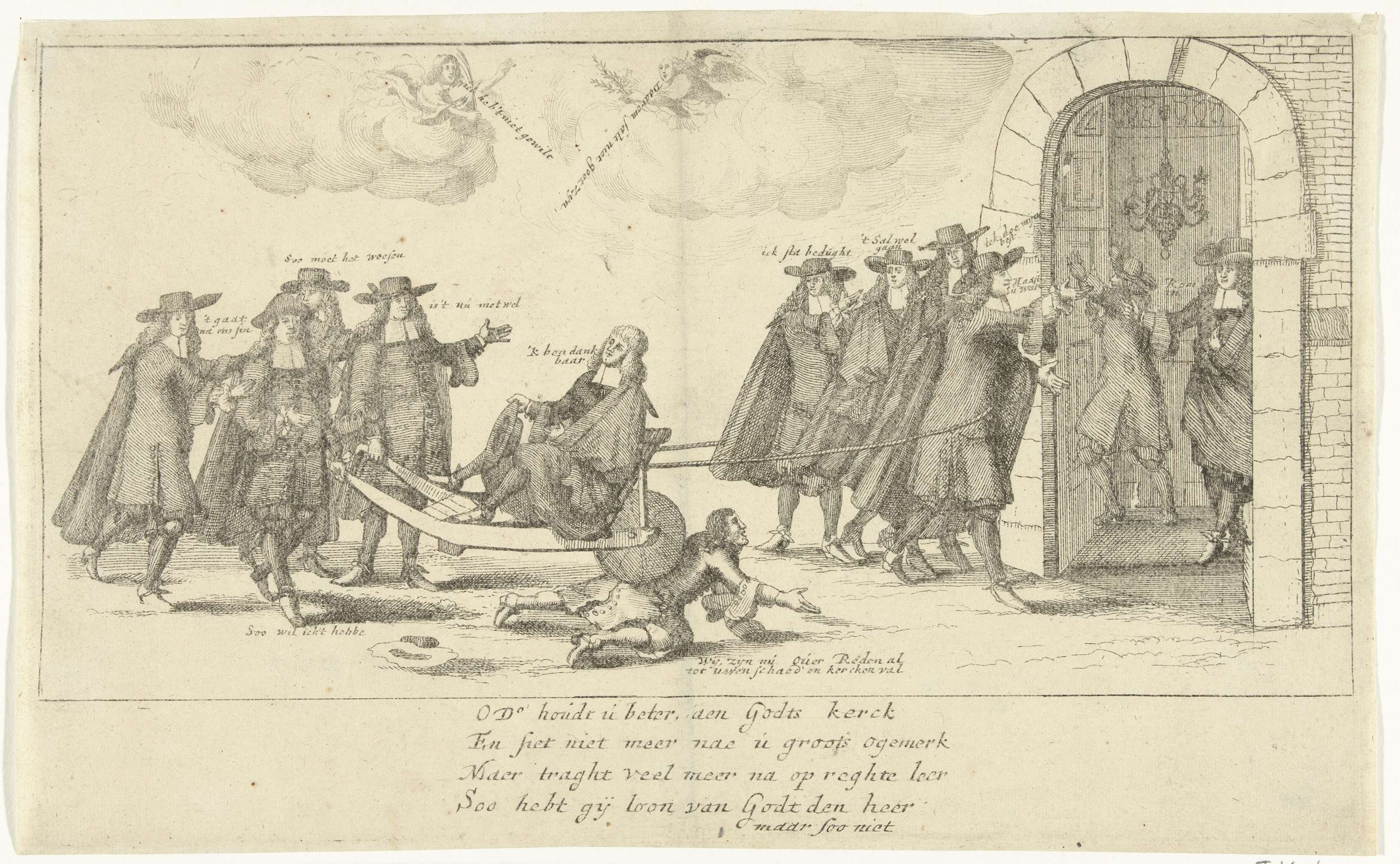 Spotprent op de lutherse kerktwisten te Amsterdam tussen de Hollandse (vrijzinnig) en de Duitse (rechtzinnig) richting binnen de lutherse gemeente en die een hoogtepunt bereiken in de strijd rond de aanstelling van de predikant Theodorus Dominicus te Amsterdam in 1683. Dominicus zittend op een kruiwagen wordt door twee groepen van 4 man getrokken en geduwd ...