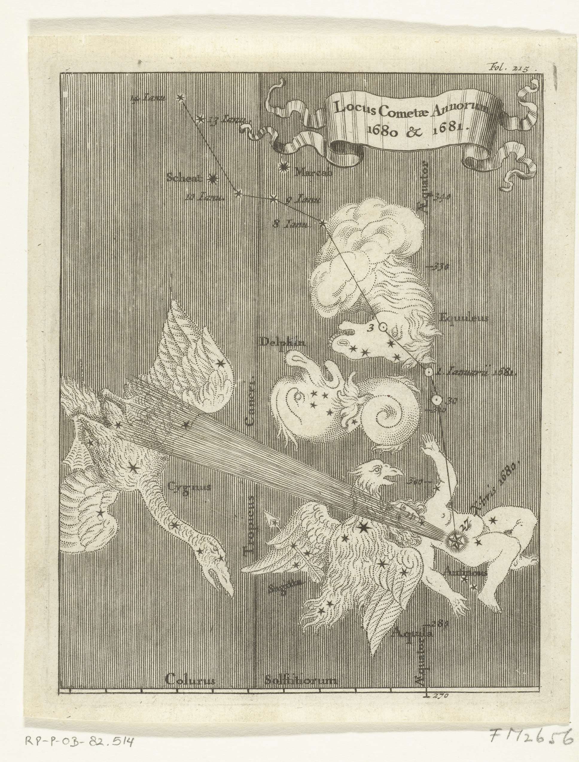 De komeet zichtbaar in de winter van 1680-1681. Astronomische voorstelling van de plaats van de komeet tussen de tekens van de Dierenriem. Gemerkt rechtsboven: Fol. 215.