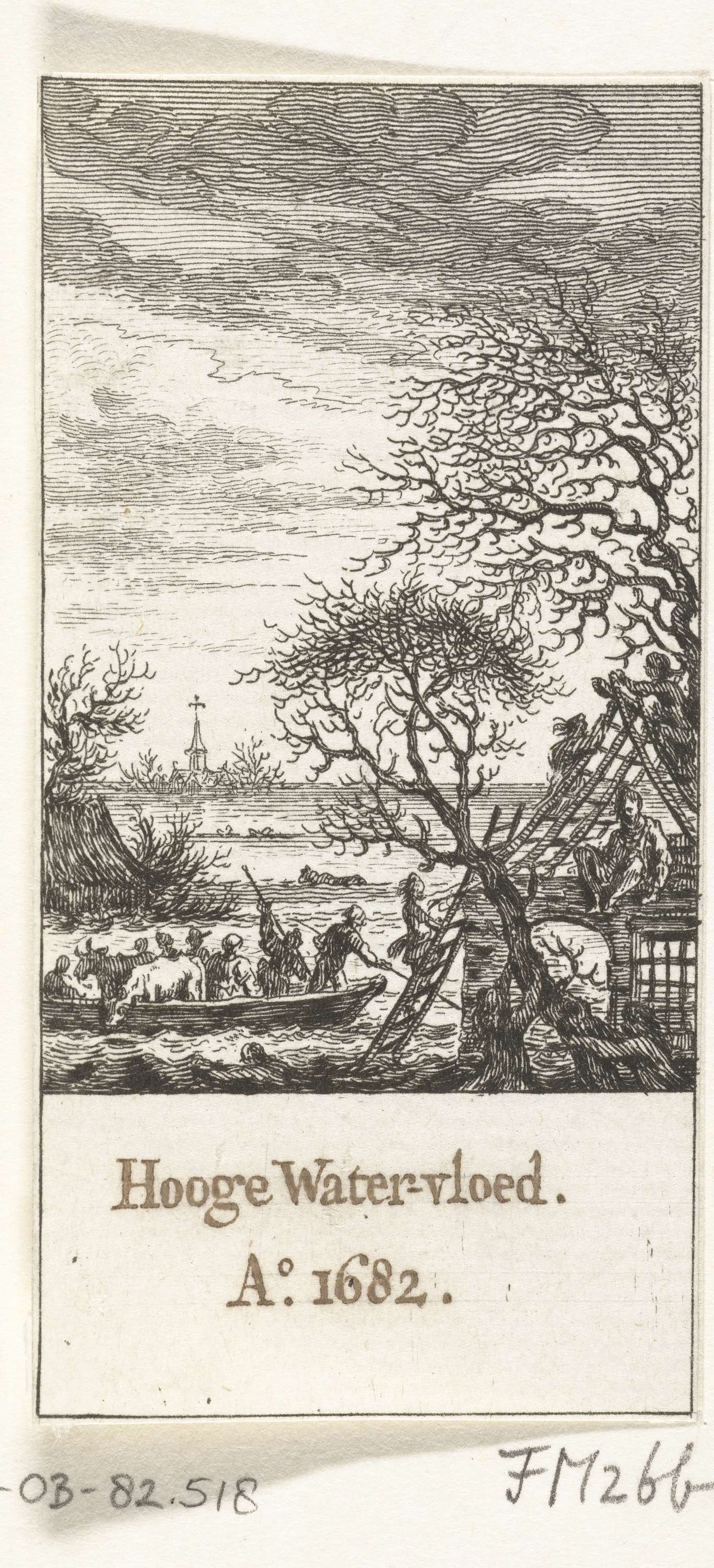 Watersnood in het jaar 1682. Met een boot worden mensen van het dak van een schuur gered.
