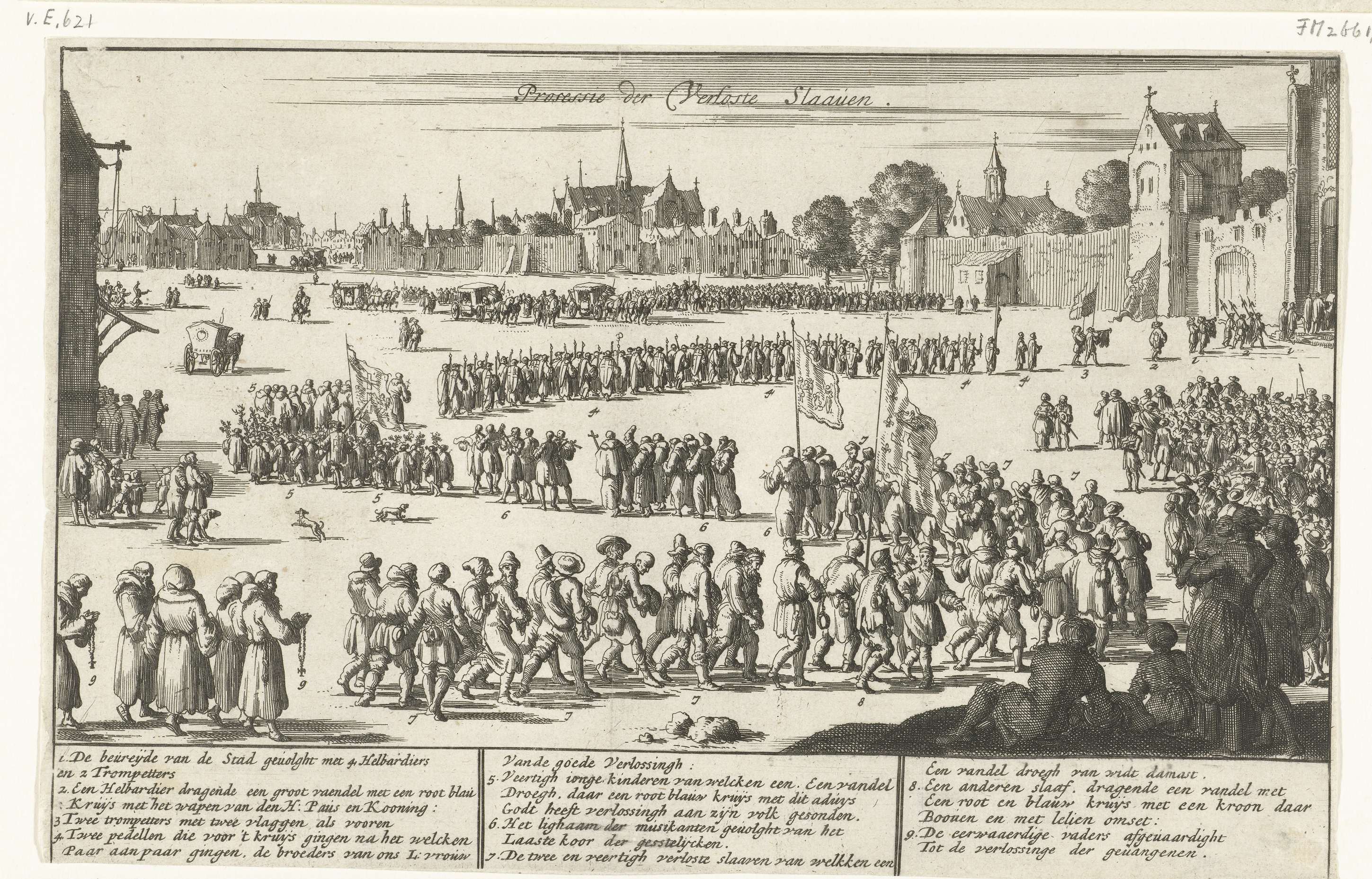 42 Franse mannen, die in Tunis in slavernij verkeerden, zijn daar vrijgekocht door de Orde der Trinitariërs. Dergelijke slaafgemaakten stonden bekend als 'christenslaven'. Ter ere van hun vrijkoping worden ze in Parijs in een processie door de stad gevoerd. In het onderschrift de legenda 1-9. Rechtsboven genummerd, hier weggesneden: fol: 59.