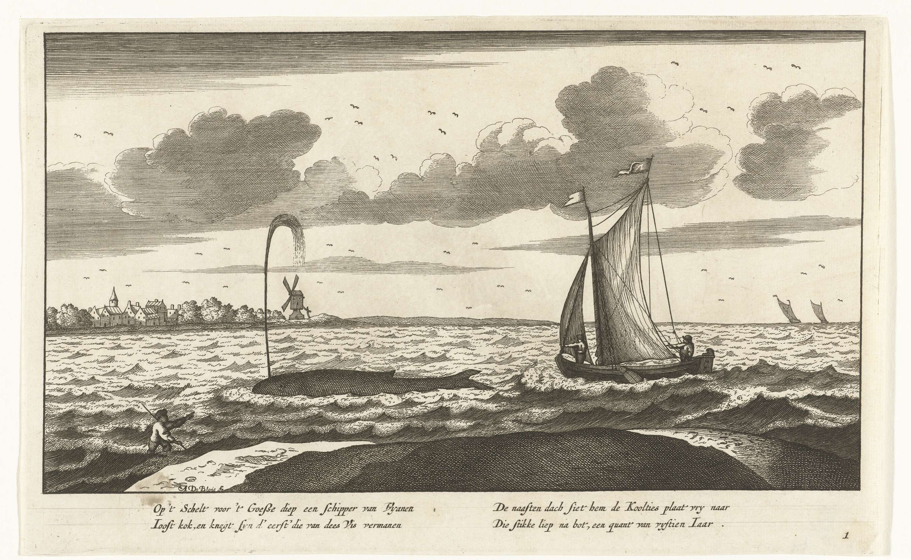 De visser Joost Kok uit Vianen ontdekt de walvis. In het onderschrift een vers van 4 regels. Prent nr. 1 in een serie van zes prenten over het vangen van een walvis bij Sint Annaland op het eiland Tholen, 7 oktober 1682.