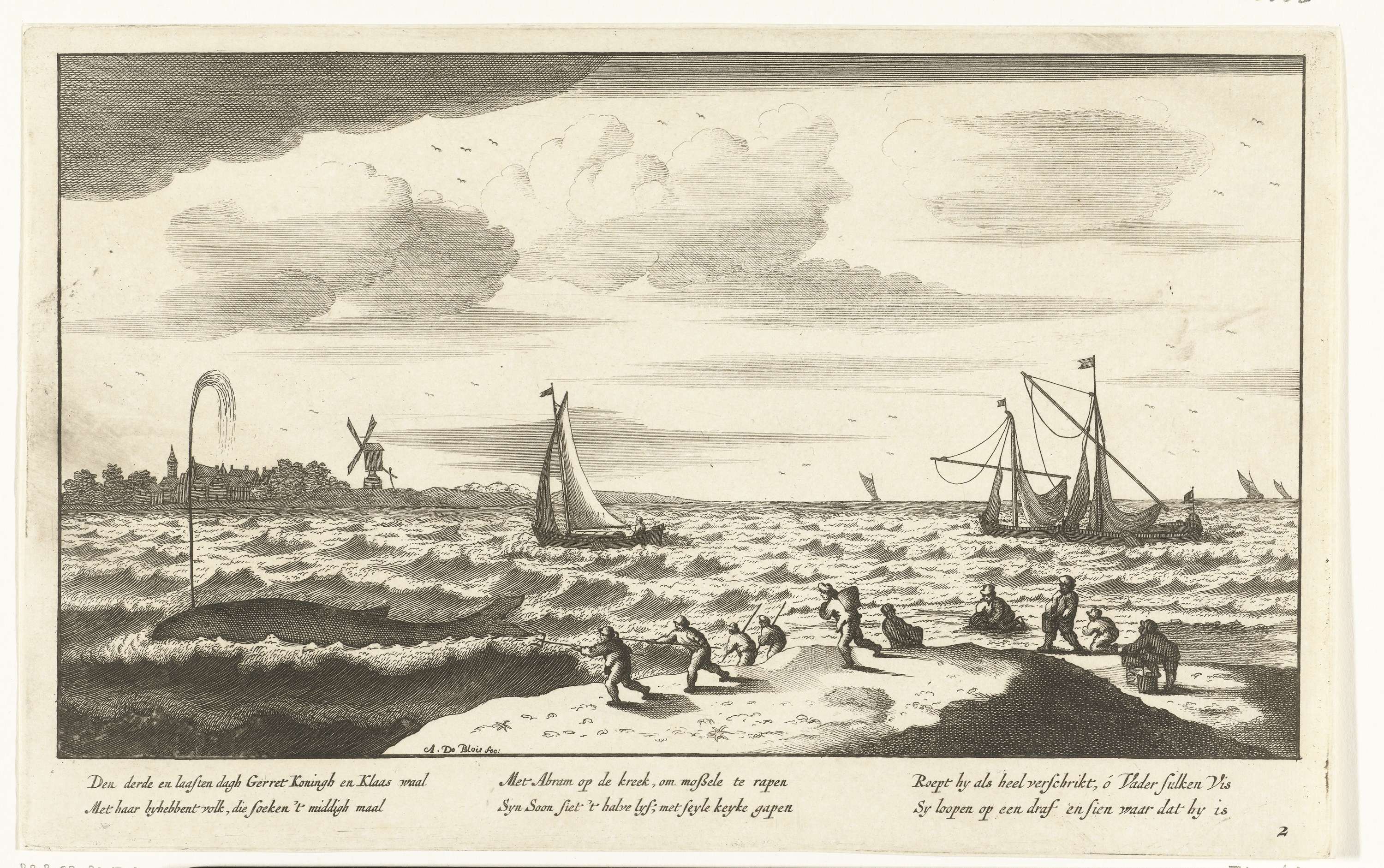 De walvis wordt door andere vissers gezien. In het onderschrift een vers van 6 regels. Prent nr. 2 in een serie van zes prenten over het vangen van een walvis bij Sint Annaland op het eiland Tholen, 7 oktober 1682.