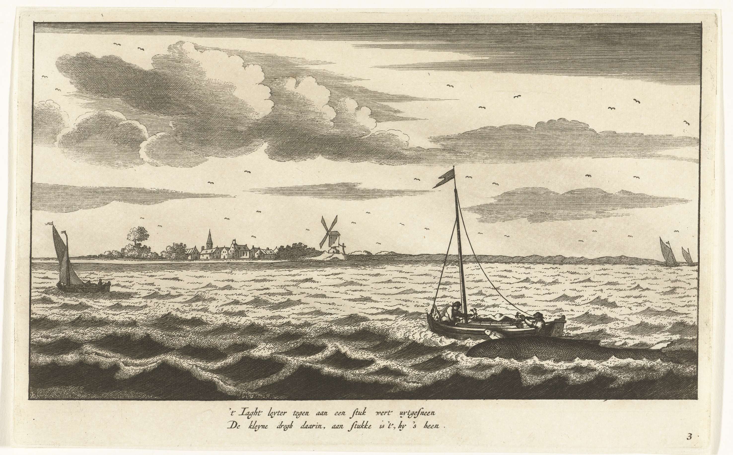 De walvis wordt gevangen door de visser Abr. Jansz. van Oelen en zijn zoon. In het onderschrift een vers van 2 regels. Prent nr. 3 in een serie van zes prenten over het vangen van een walvis bij Sint Annaland op het eiland Tholen, 7 oktober 1682.