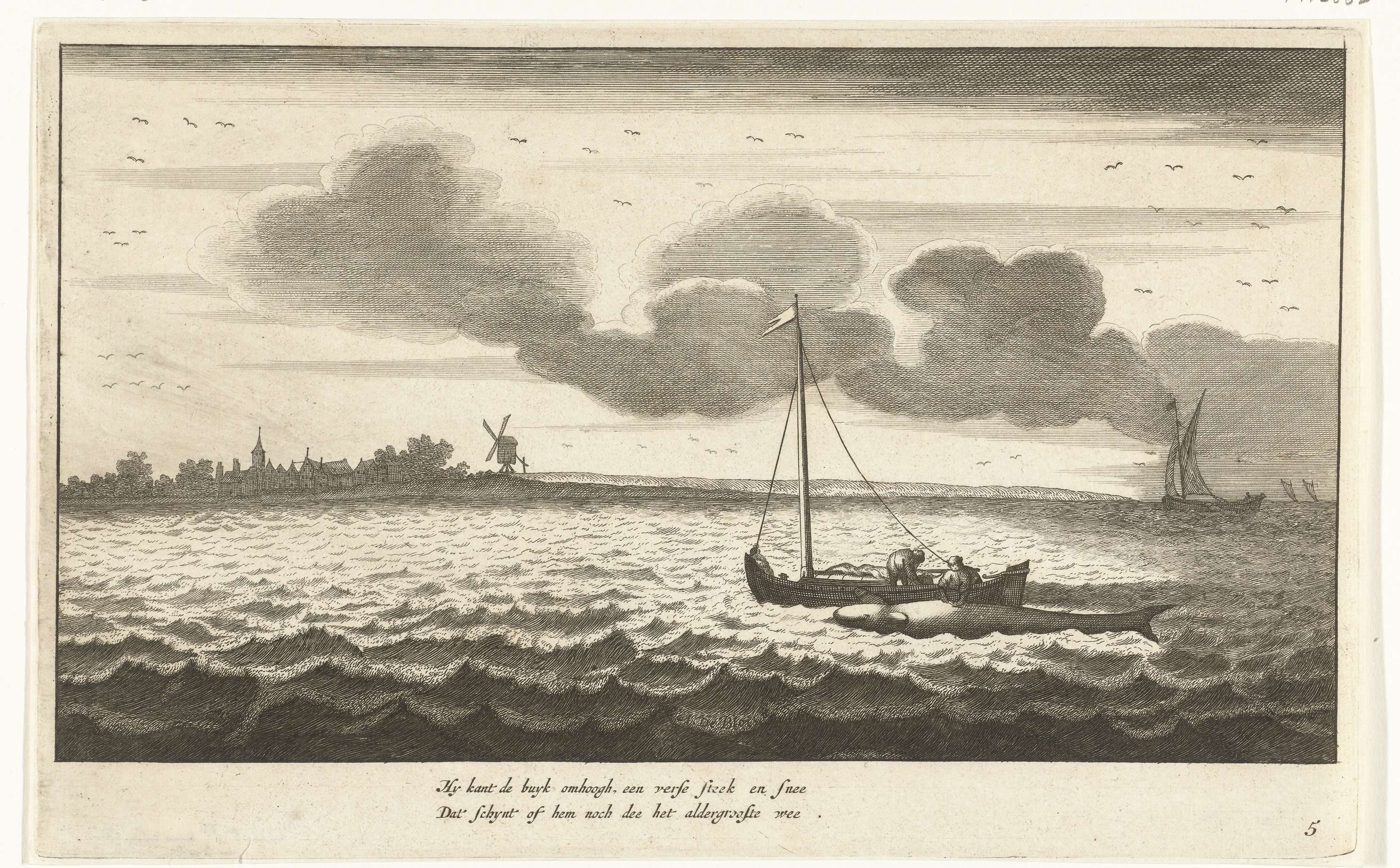 De walvis wordt gedood door de visser Abr. Jansz. van Oelen en zijn zoon. In het onderschrift een vers van 2 regels. Prent nr. 5 in een serie van zes prenten over het vangen van een walvis bij Sint Annaland op het eiland Tholen, 7 oktober 1682.