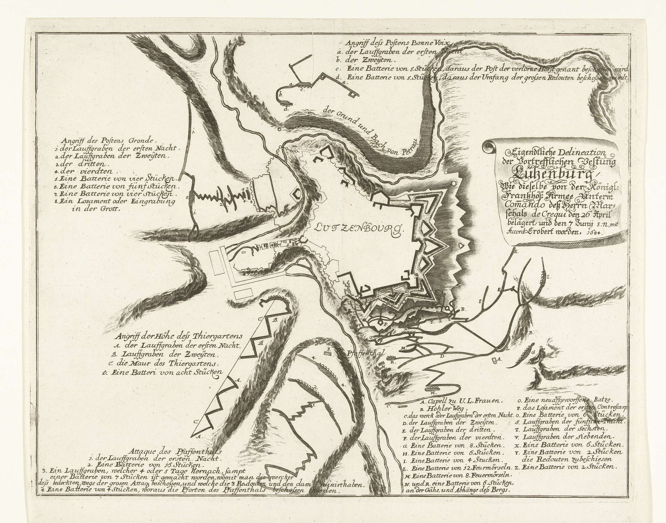 Plattegrond van de versterkingen om de stad Luxemburg, belegerd door het Franse leger onder maarschalk François de Créquy en de marquis de Vauban vanaf 26 april en veroverd op 4 juni 1684. Kaart waarop met cijfers en letters de posities van de loopgraven en batterijen geschut van de belegeraars zijn aangeduid.
