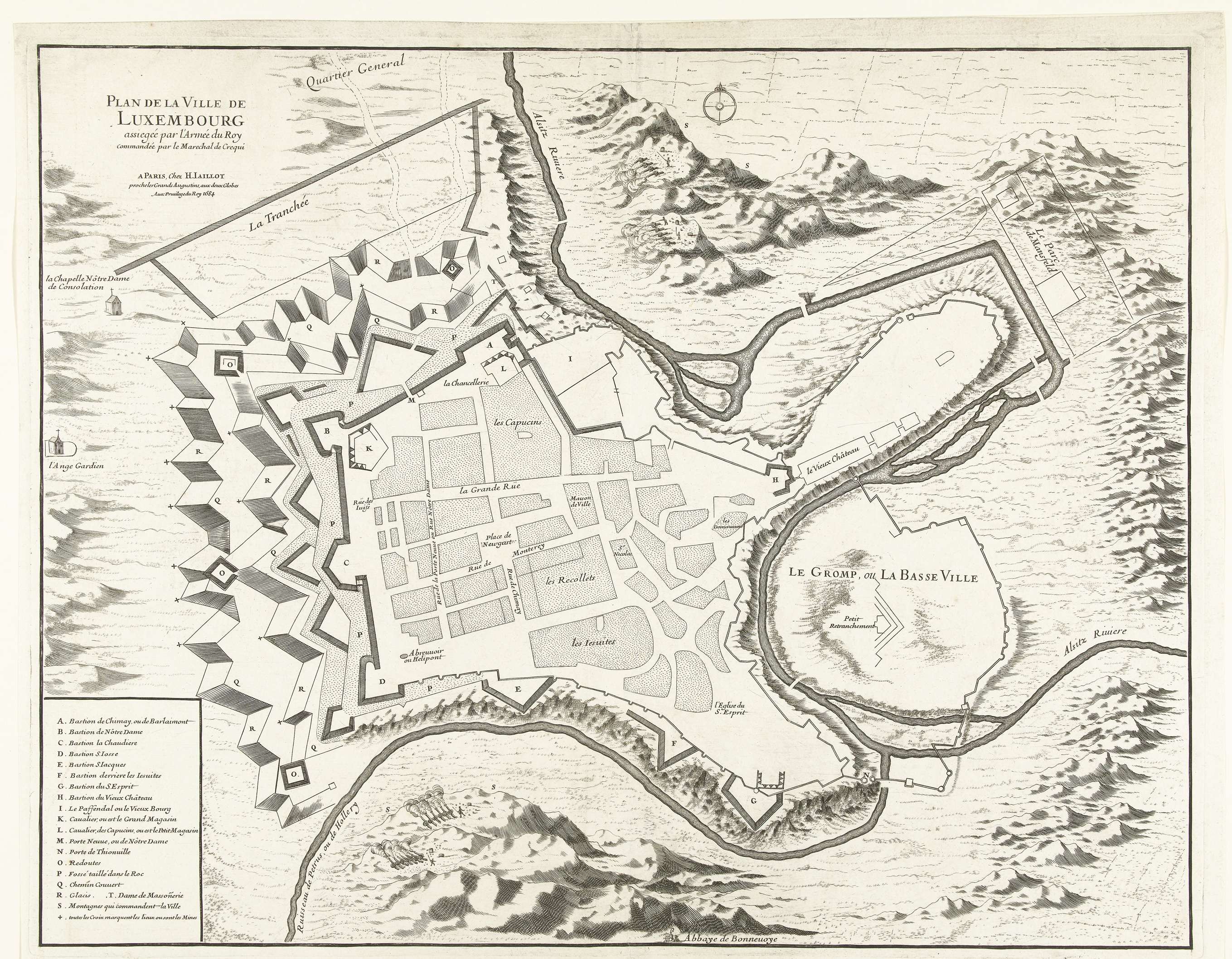 Plattegrond van de versterkingen om de stad Luxemburg, belegerd door het Franse leger onder maarschalk François de Créquy en de marquis de Vauban vanaf 26 april en veroverd op 4 juni 1684. Linksonder de legenda A-T in het Frans.