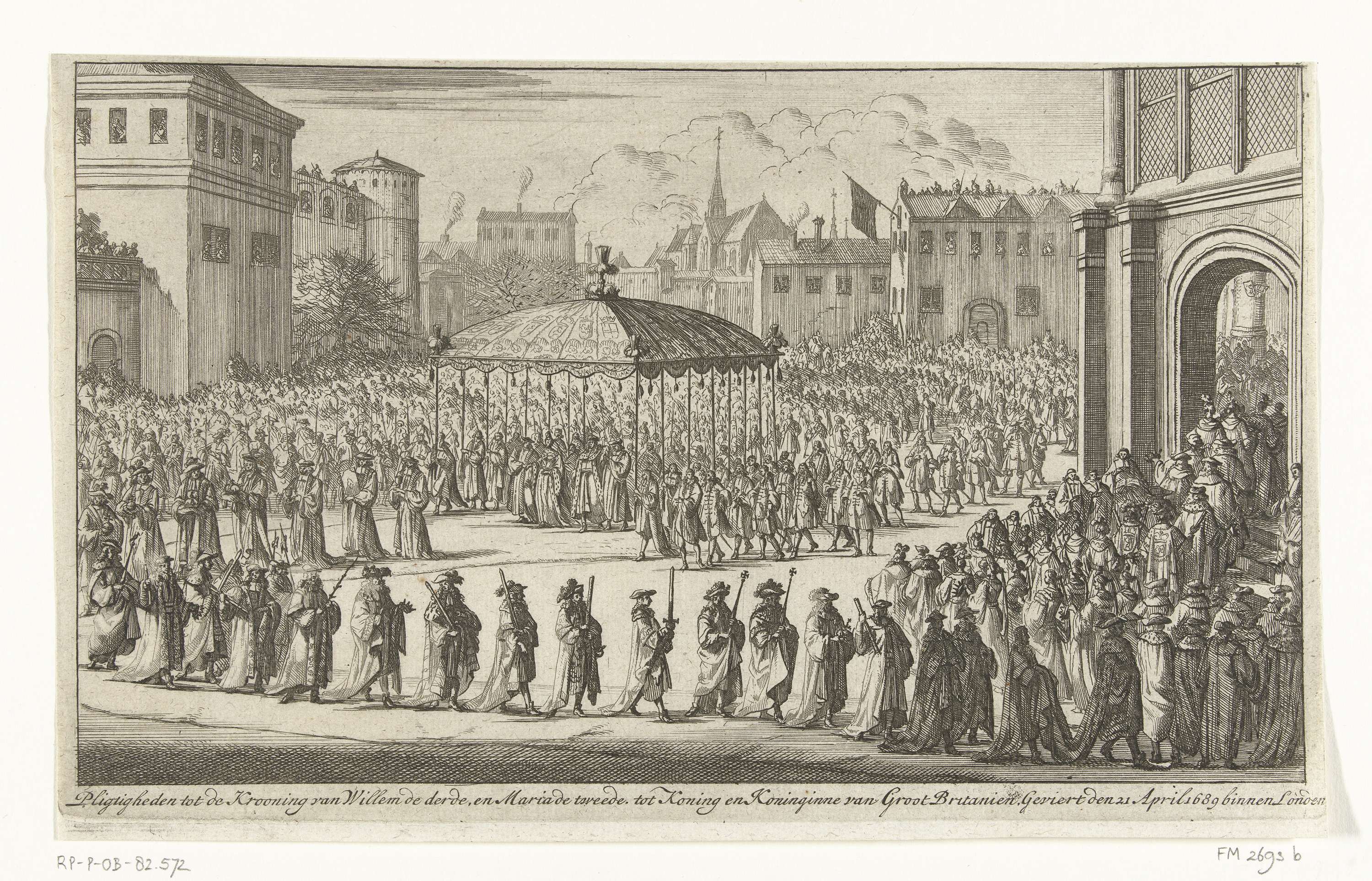 Optocht naar de kroningsceremonie, 21 april 1689. Willem en Mary onder een baldakijn in een lange stoet onderweg naar Westminster Abbey.
