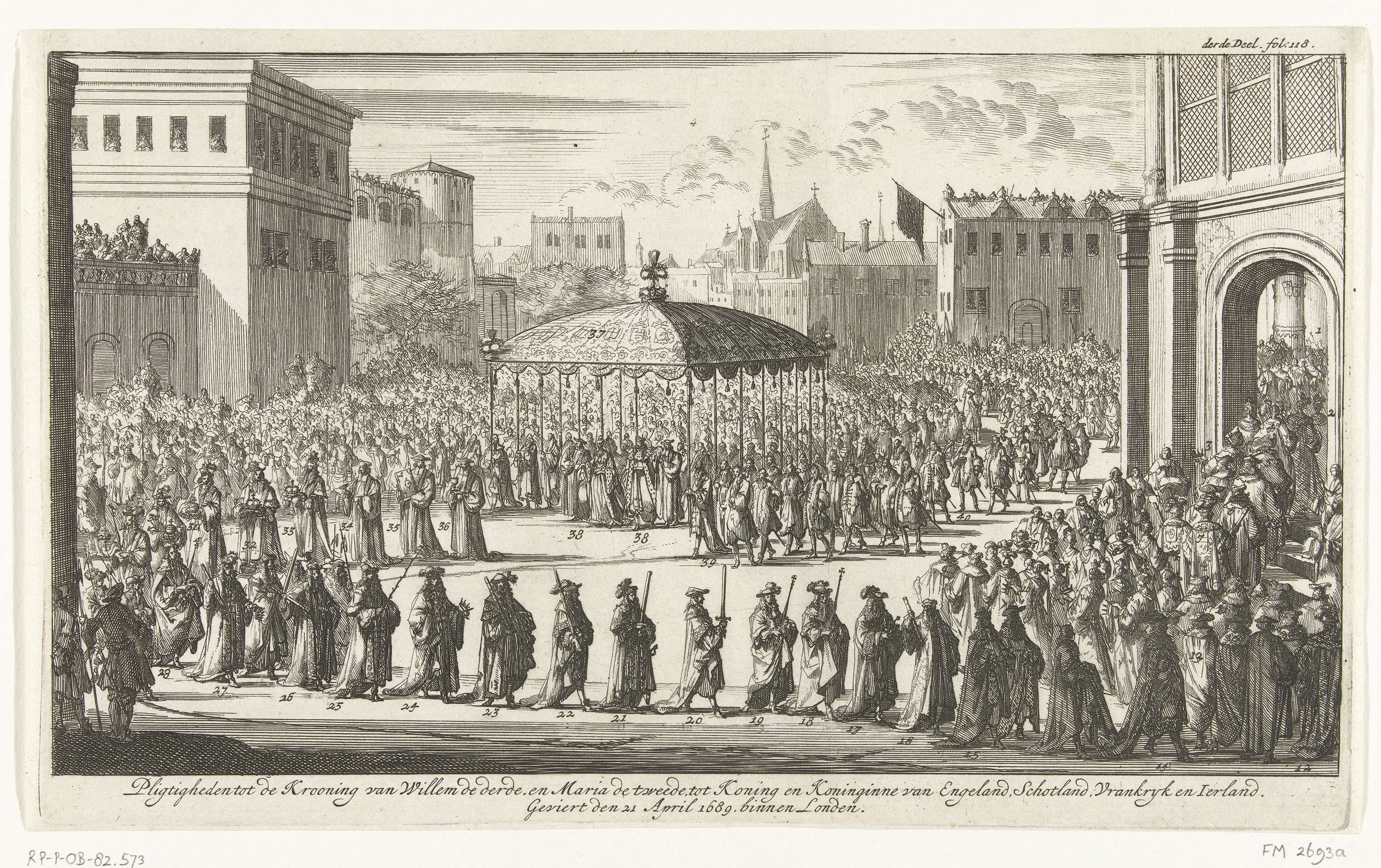 Optocht naar de kroningsceremonie, 21 april 1689. Willem en Mary onder een baldakijn in een lange stoet onderweg naar Westminster Abbey. Met cijfers in de voorstelling en gemerkt rechtsboven: derde Deel. fol. 118.