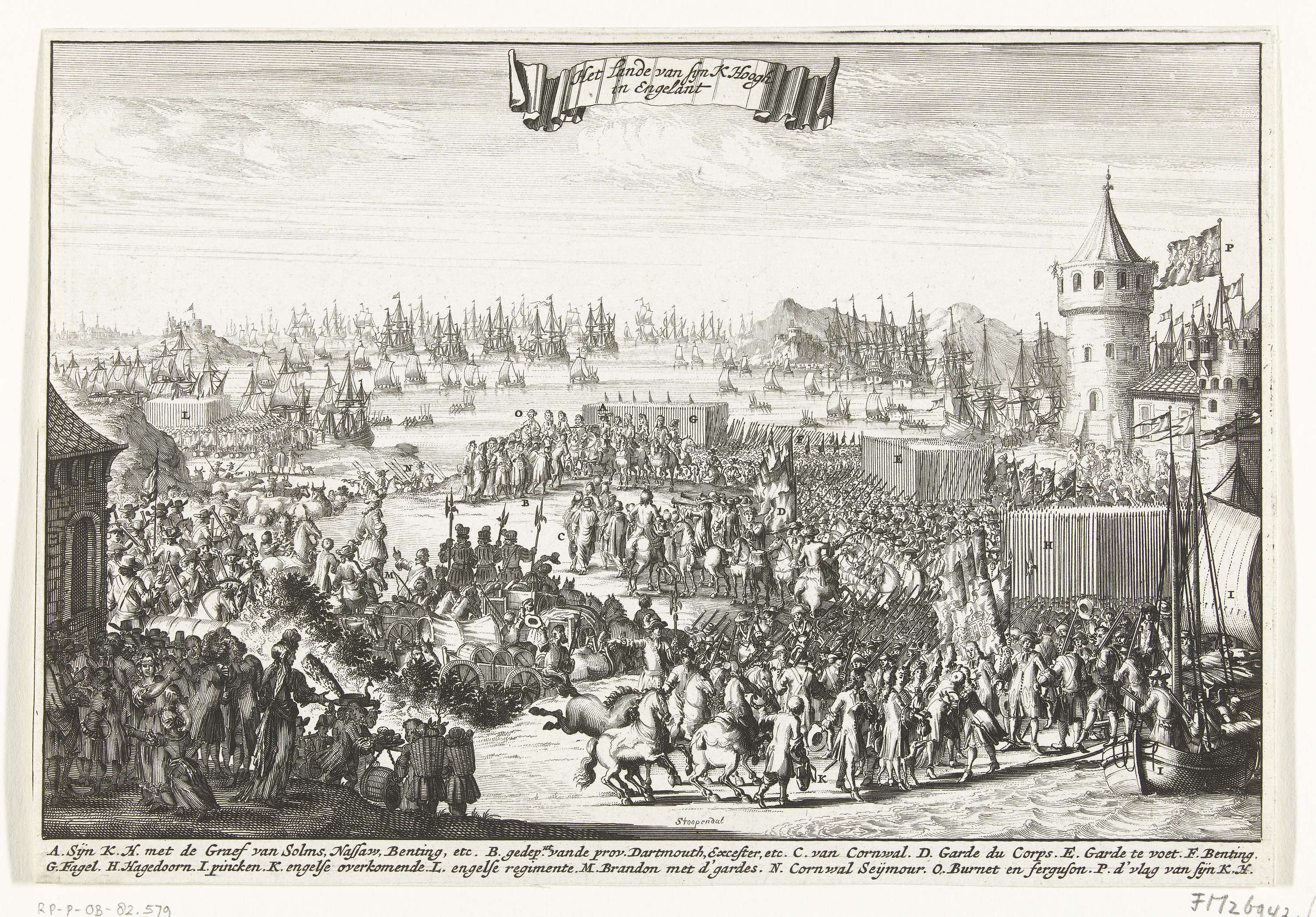 Landing van prins Willem III bij Torbay in Engeland, 15 november 1688. De prins gaat met zijn legers aan land, een grote vloot schepen ligt voor de kust voor anker. In het onderschrift de legenda A-P.