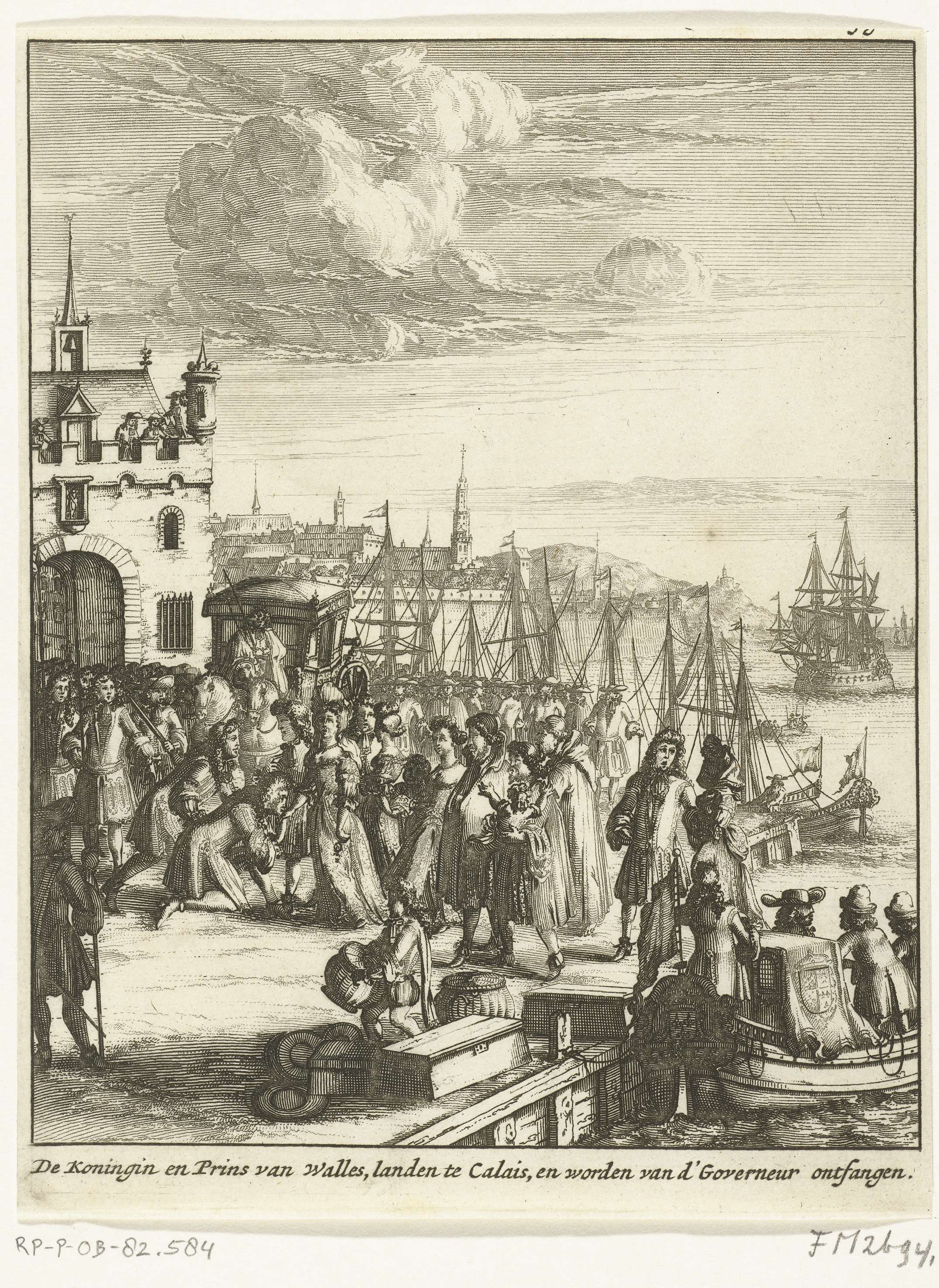 Aankomst van de gevluchte Engelse koningin Maria van Modena te Calais in Frankrijk, eind december 1688. Zij wordt op de kade ontvangen door vertegenwoordigers van de Franse koning.