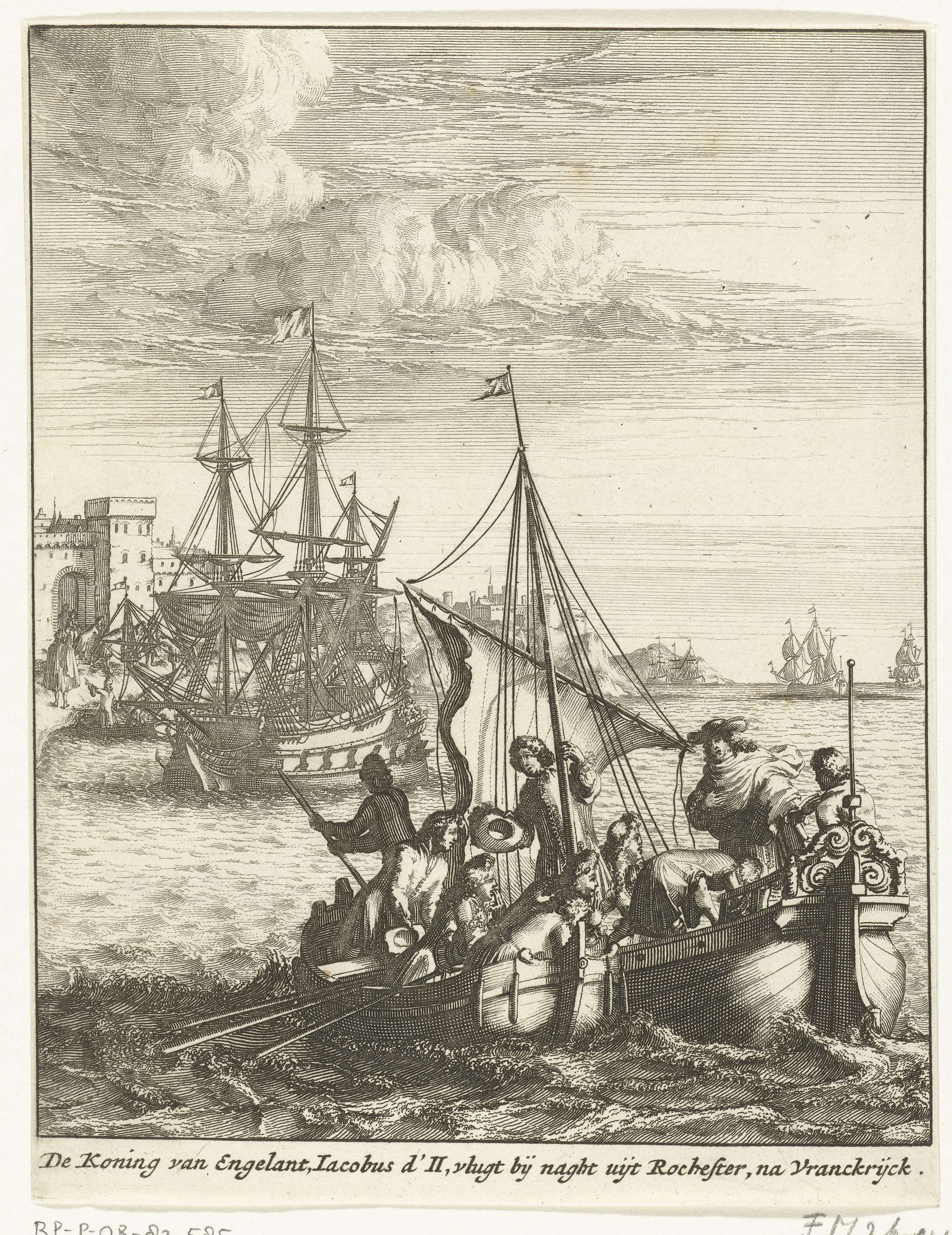De vlucht van de Engelse koning Jacobus II van Rochester naar Frankrijk, 2 januari 1689. De koning vaart met een sloep naar het schip dat hem naar Frankrijk zal brengen.