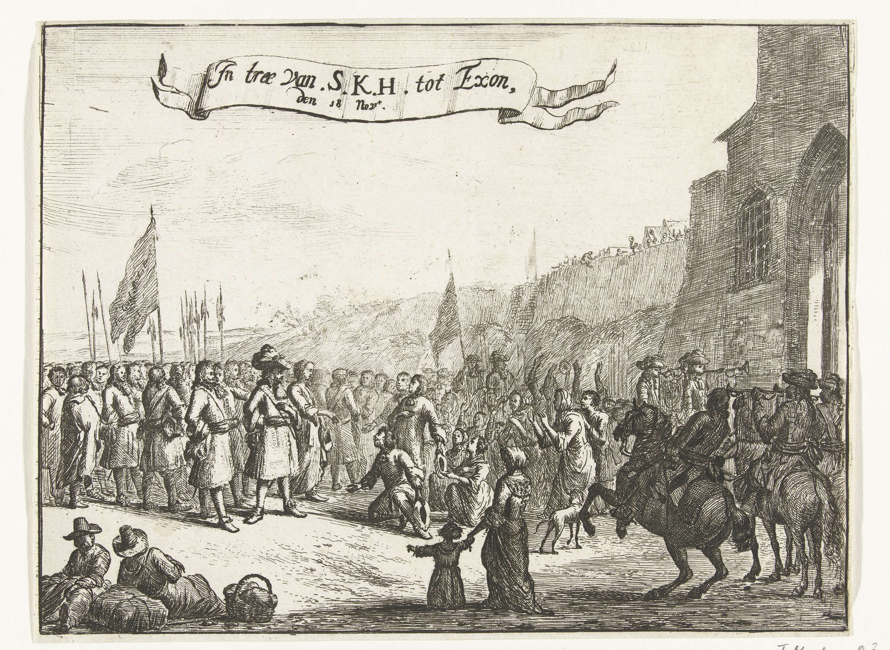 Prins Willem III met zijn leger wordt bij de stadspoort van Exmouth (of Exeter) verwelkomd door vertegenwoordigers van de stad, 18 november 1688.