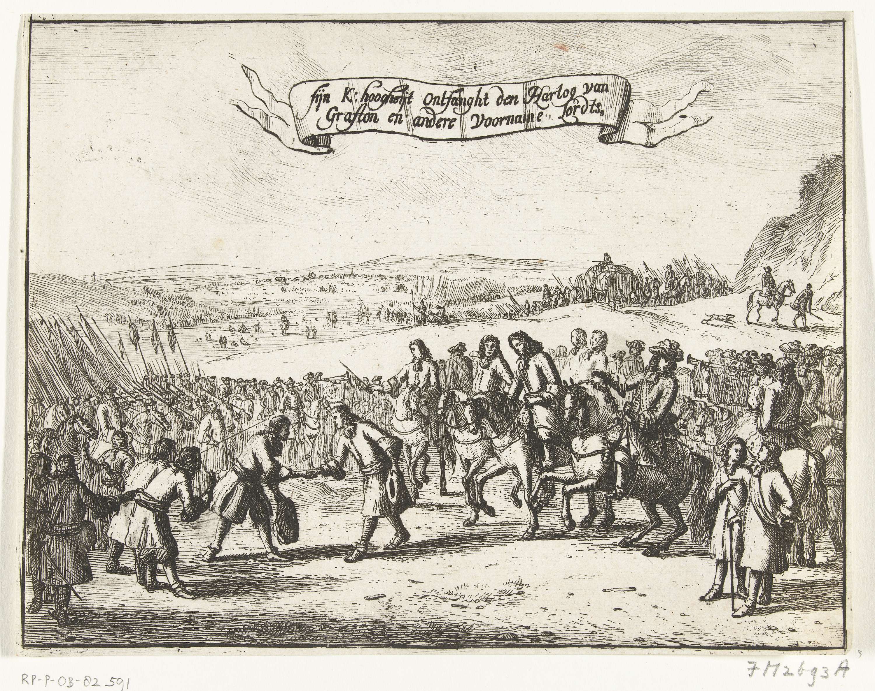 Prins Willem III schudt de hand van Henry Fitzroy, 1ste hertog of Grafton. Rechts andere edelen te paard, op de achtergrond het leger van Willem III.