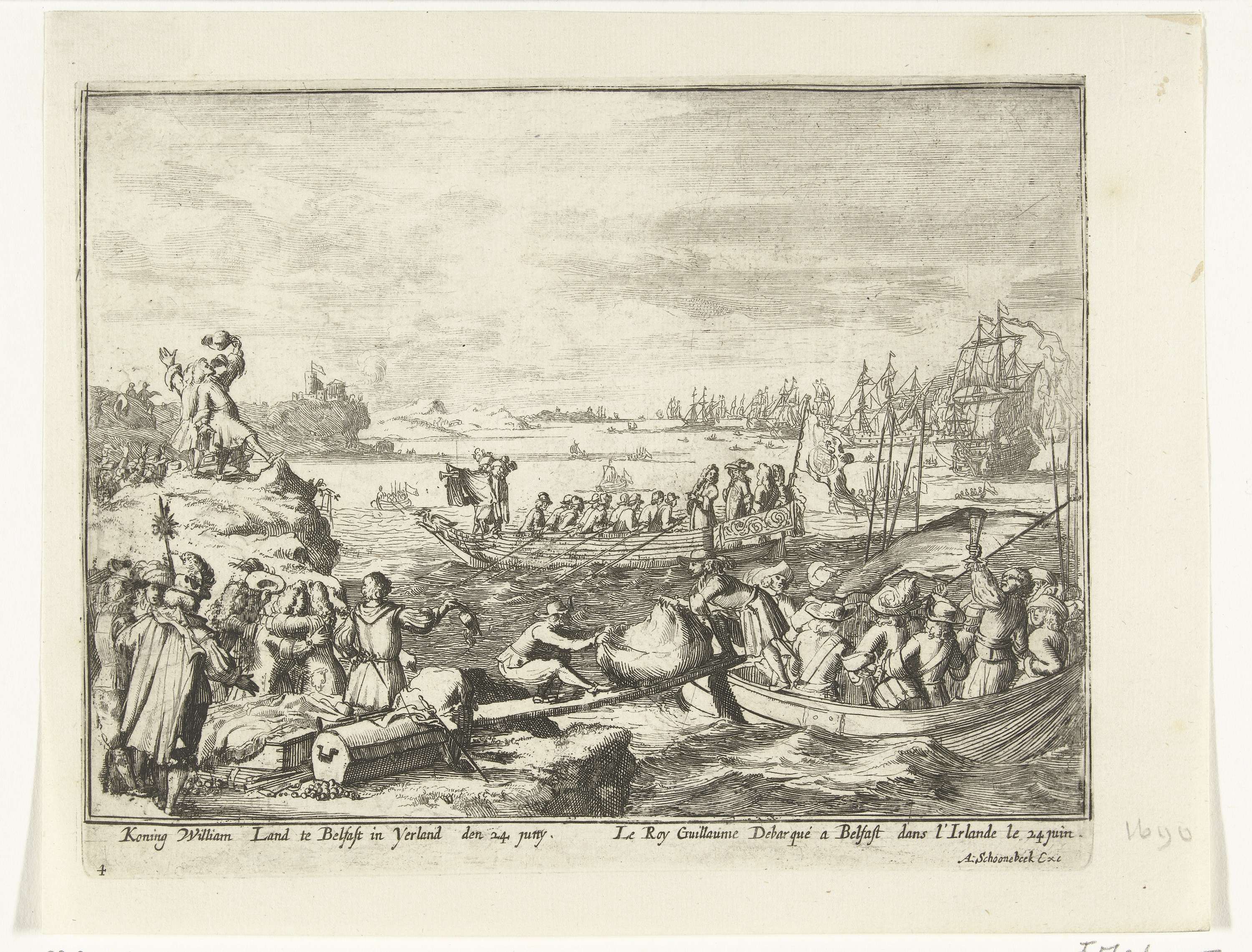 Landing van het leger van koning Willem III bij Belfast, 24 juni 1690. Plaat nr. 4 in de serie 'Engelands schouwtoneel' over de oorlog tussen Willem III en Jacobus II in de jaren 1690-1691 na de Glorious Revolution, (derde deel). Met onderschriften in het Nederlands en Frans.