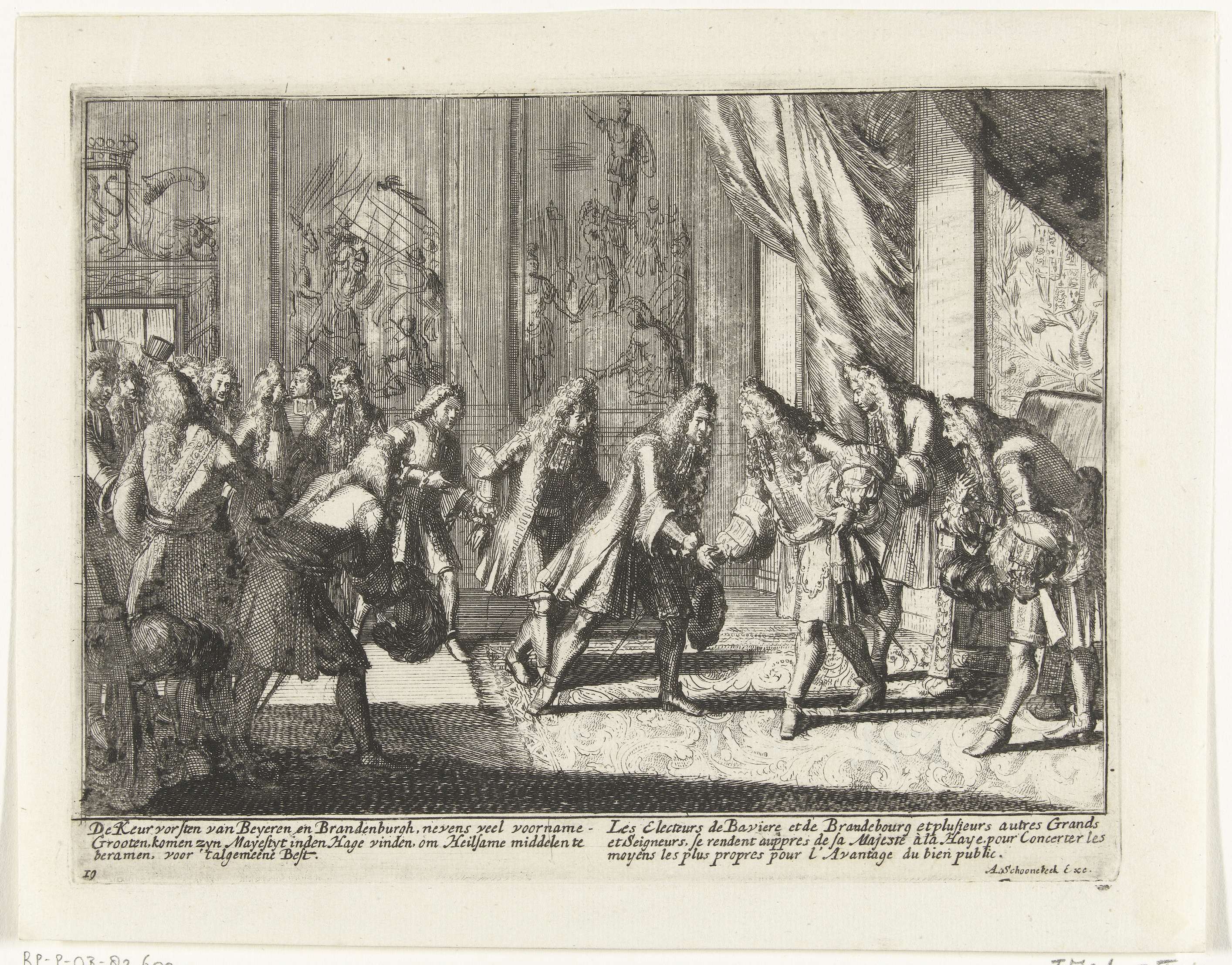 De keurvorsten van Beieren en van Brandenburg op bezoek bij koning Willem III, 1691. De vorsten begroeten elkaar en schudden elkaar de hand. Plaat nr. 19 in de serie 'Engelands schouwtoneel' over de oorlog tussen Willem III en Jacobus II in de jaren 1690-1691 na de Glorious Revolution, (derde deel). Met onderschriften in het Nederlands ...