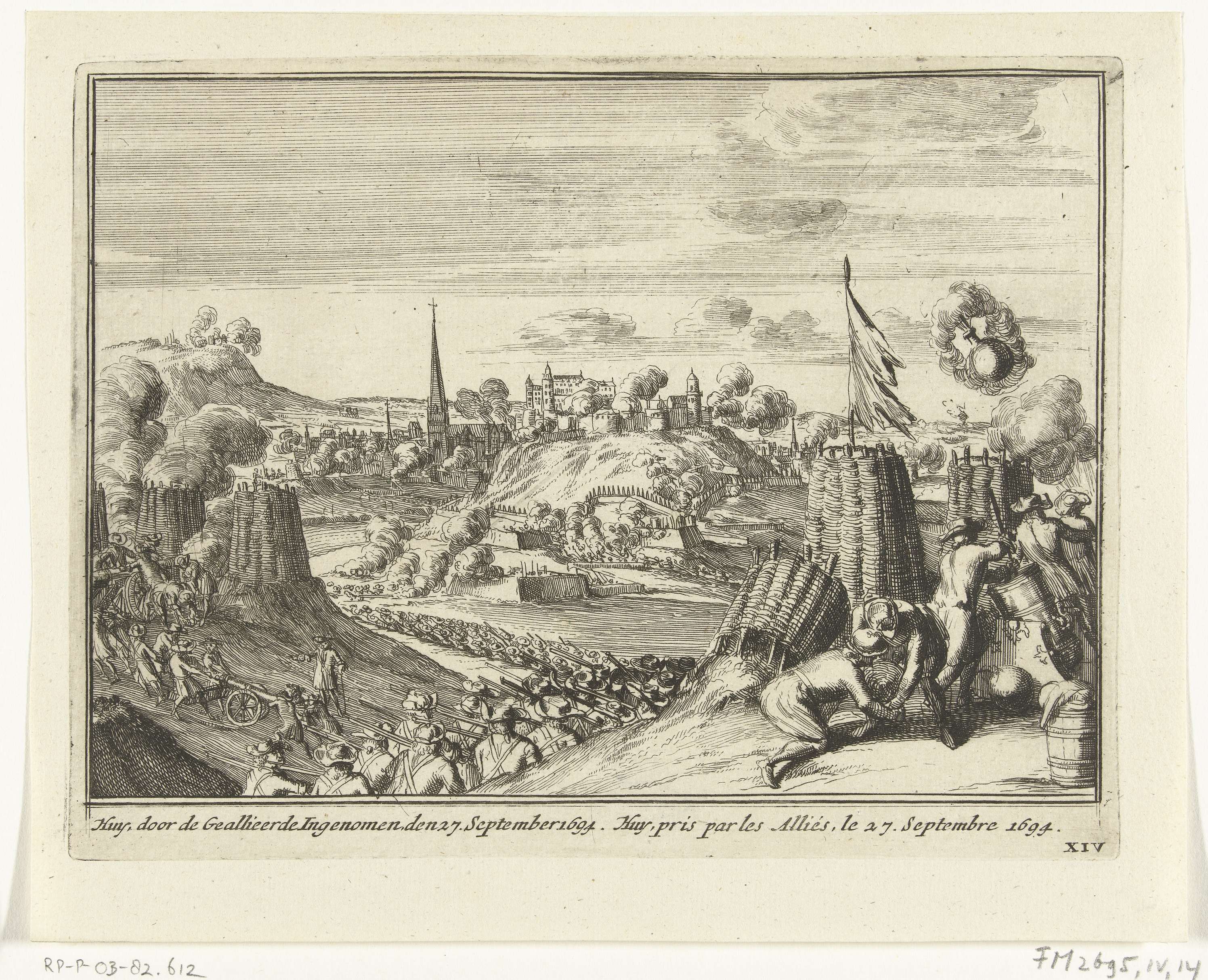 Inname van Huy door het geallieerde leger, 27 september 1694. Plaat nr. XIV in de serie 'Engelands schouwtoneel' over oorlogen gevoerd door Willem III in de jaren 1691-1695 na de Glorious Revolution, (vierde deel). Met onderschriften in het Nederlands en Frans.