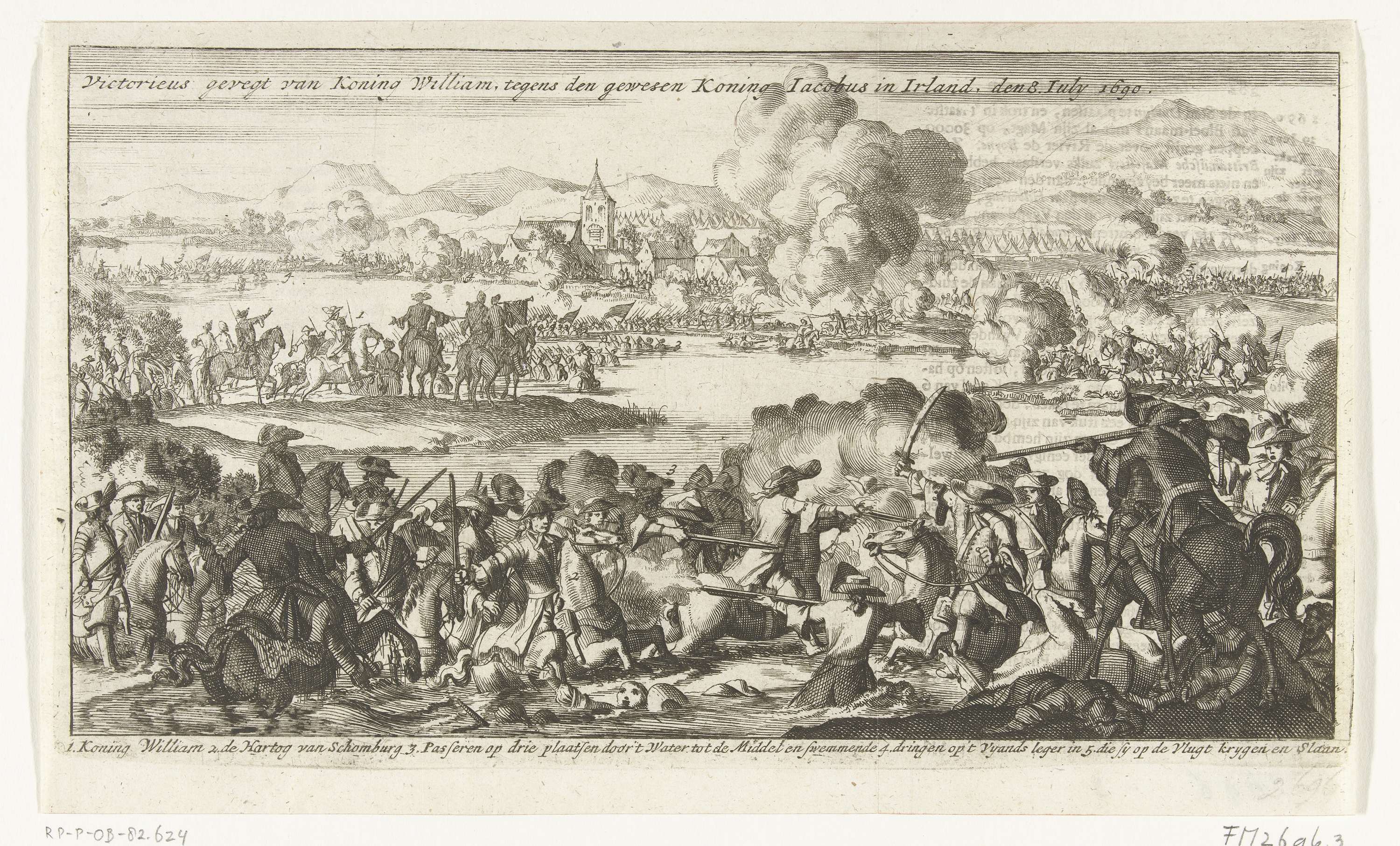 Slag bij de rivier de Boyne op 11 juli 1690, waarbij het leger van Willem III en overwinning behaalt op de katholieken onder Jacobus II. In het midden de hertog van Schomberg te paard die in de slag zou sneuvelen. In het onderschrift de legenda 1-5.
