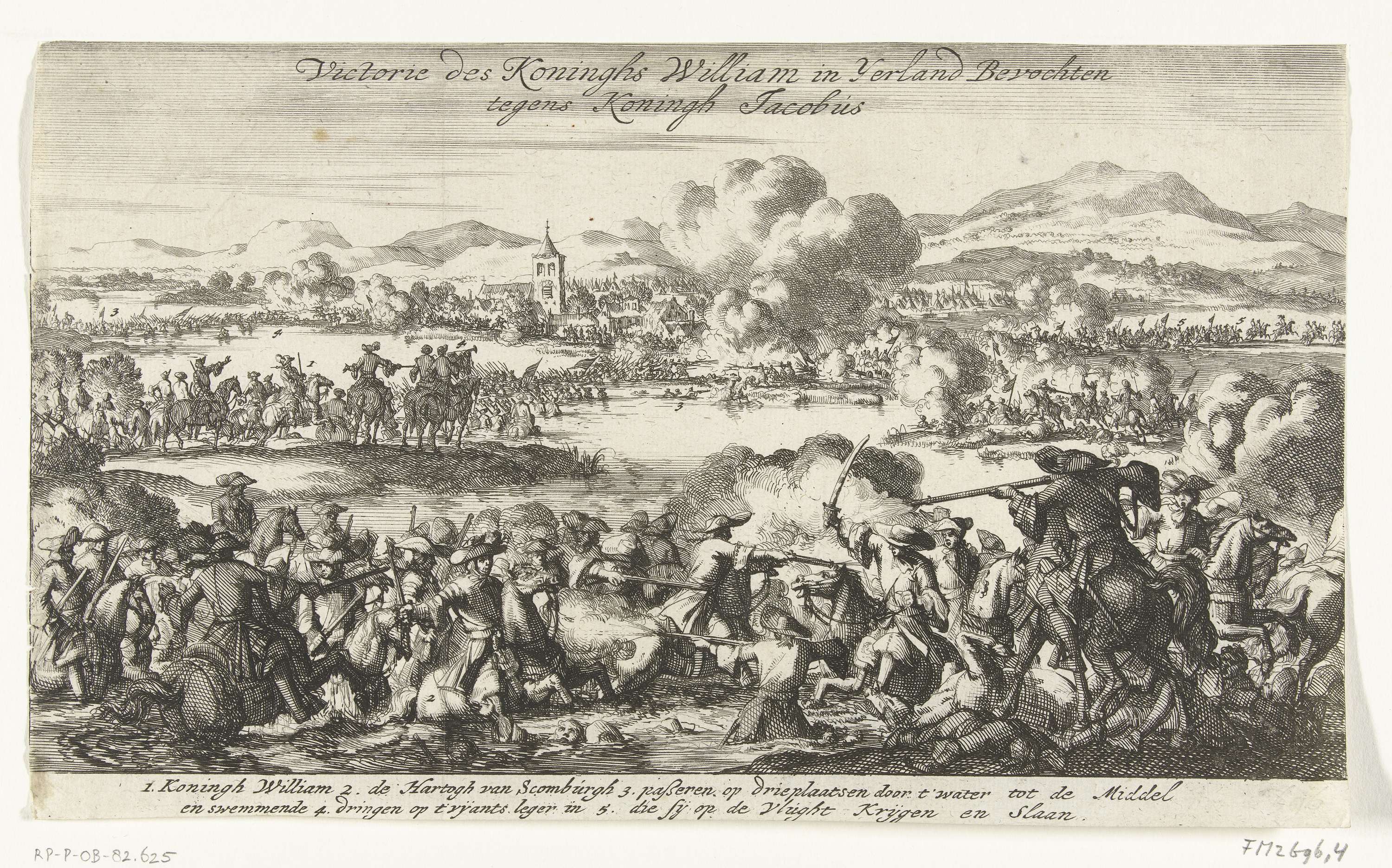 Slag bij de rivier de Boyne op 11 juli 1690, waarbij het leger van Willem III een overwinning behaalt op de katholieken onder Jacobus II. In het midden de hertog van Schomberg te paard die in de slag zou sneuvelen. In het onderschrift de legenda 1-5.